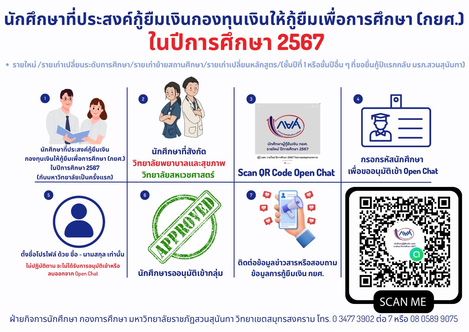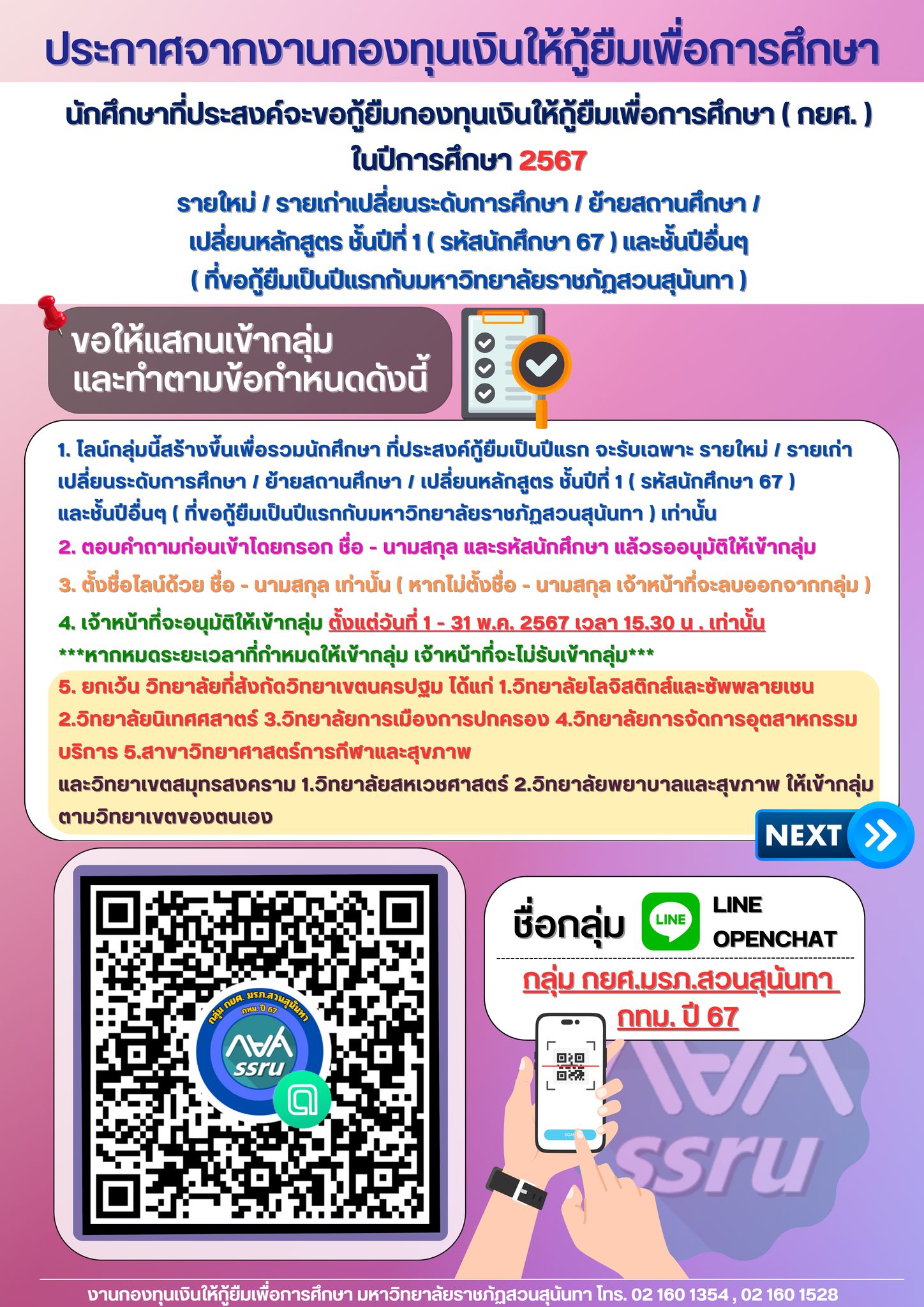 1. ไลน์กลุ่มนี้สร้างขึ้นเพื่อรวมนักศึกษา ที่ประสงค์กู้ยืมเป็นปีแรก จะรับเฉพาะ รายใหม่ / รายเก่าเปลี่ยนระดับการศึกษา / ย้ายสถานศึกษา / เปลี่ยนหลักสูตร ชั้นปีที่ 1 ( รหัสนักศึกษา 67 ) และชั้นปีอื่นๆ ( ที่ขอกู้ยืมเป็นปีแรกกับมหาวิทยาลัยราชภัฏสวนสุนันทา ) เท่านั้น