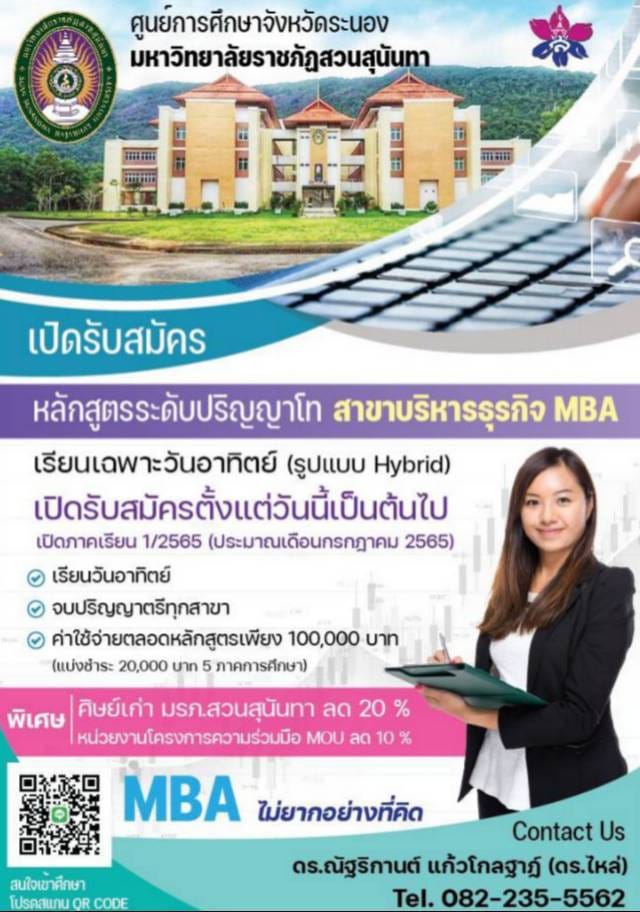 ศูนย์การศึกษาจังหวัดระนอง มหาวิทยาลัยราชภัฏสวนสุนันทา เปิดรับสมัครหลักสูตรปริญญาโท สาขาบริหารธุรกิจMBA