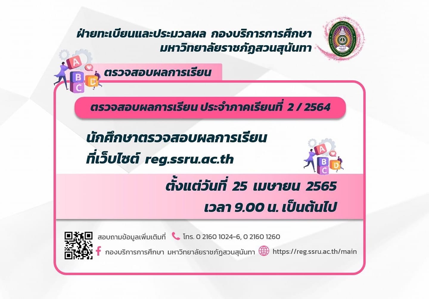 Students can check their results at http://reg.ssru.ac.th. From April 25, Tho 2022 at 9:00 a.m. onwards.