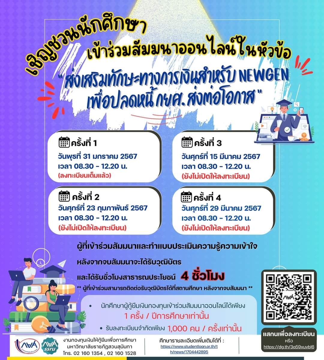 - นักศึกษาผู้กู้ยืมเงินกองทุนฯเข้าร่วมสัมมนาออนไลน์ได้เพียง 1 ครั้ง/ปีการศึกษาเท่านั้น