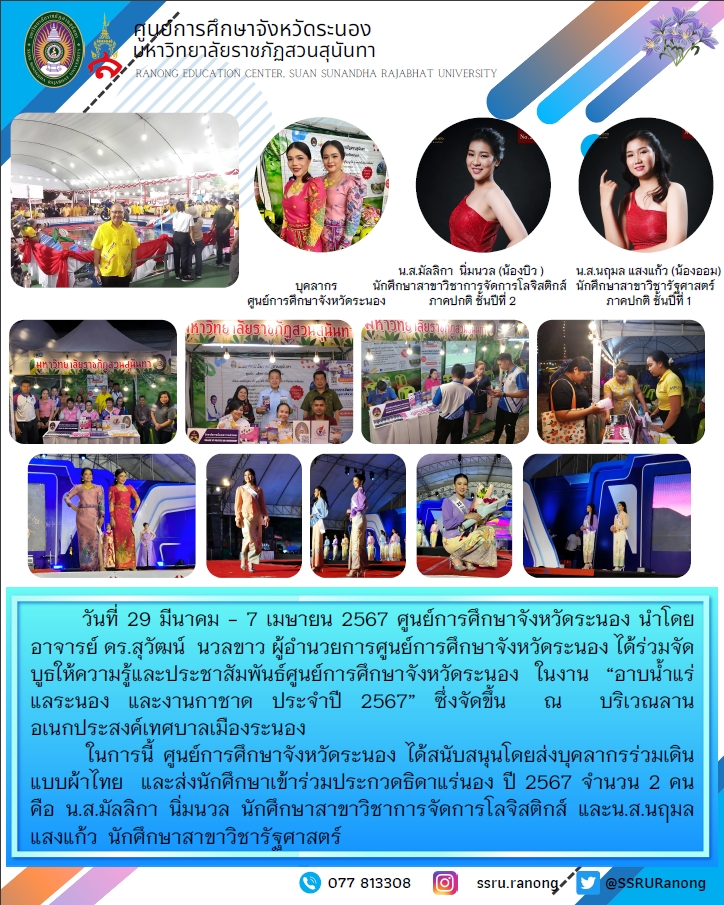 ในการนี้ ศูนย์การศึกษาจังหวัดระนอง ได้สนับสนุนโดยส่งบุคลากรร่วมเดินแบบผ้าไทย และส่งนักศึกษาเข้าร่วมประกวดธิดาแร่นอง ปี 2567 จำนวน 2 คน คือ น.ส.มัลลิกา นิ่มนวล นักศึกษาสาขาวิชาการจัดการโลจิสติกส์ และน.ส.นฤมล แสงแก้ว นักศึกษาสาขาวิชารัฐศาสตร์