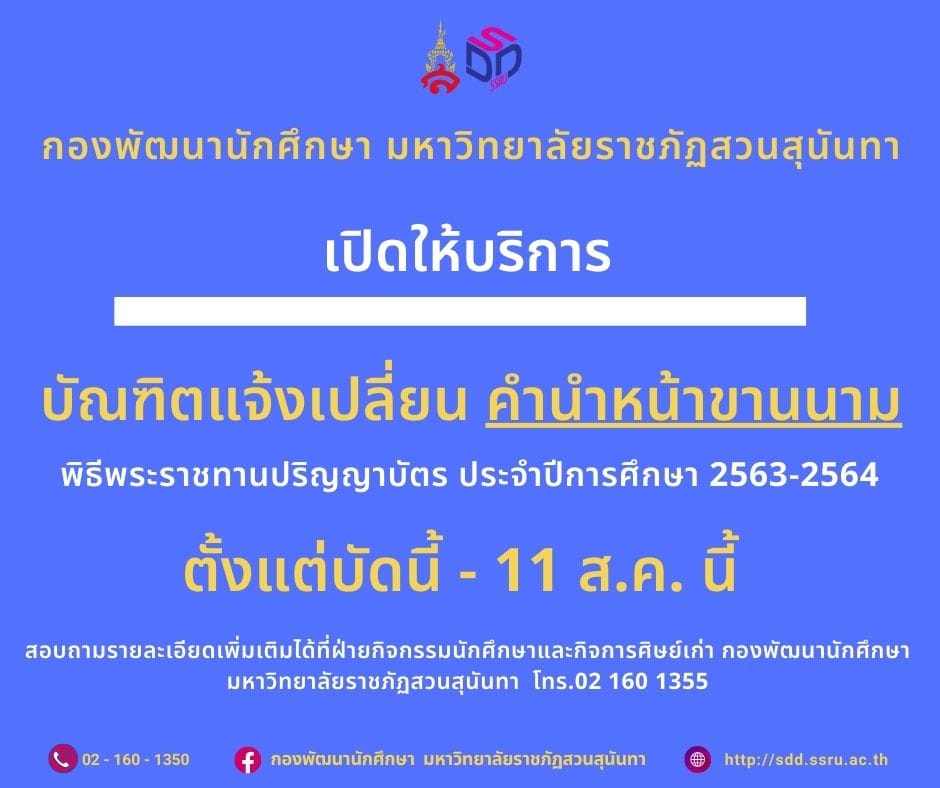 กองพัฒนานักศึกษา มหาวิทยาลัยราชภัฏสวนสุนันทา เปิดให้บริการบัณฑิตที่มีความประสงค์เปลี่ยนคำนำหน้าขานนาม ในพิธีพระราชทานปริญญาบัตร ประจำปีการศึกษา 2563-2564 ขอให้ติดต่อเขียนใบคำร้อง พร้อมเตรียมสำเนาเอกสารคำสั่งการแต่งตั้งชั้นยศ ได้ที่ชั้น 3 อาคารศูนย์สุขภาพและกีฬาสวนสุนันทา ฝ่ายกิจกรรมนักศึกษาและกิจการศิษย์เก่า กองพัฒนานักศึกษา มหาวิทยาลัยราชภัฏสวนสุนันทา ตั้งแต่บัดนี้ถึงวันที่ 11 สิงหาคม 2566 ให้บริการวันจันทร์ ถึง วันเสาร์ เวลา 08.30 – 16.30 น. (ยกเว้นวันอาทิตย์และวันหยุดนักขัตฤกษ์)