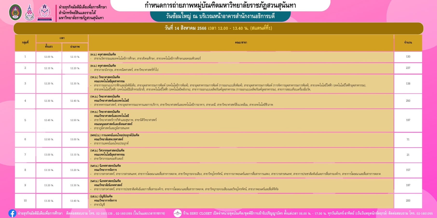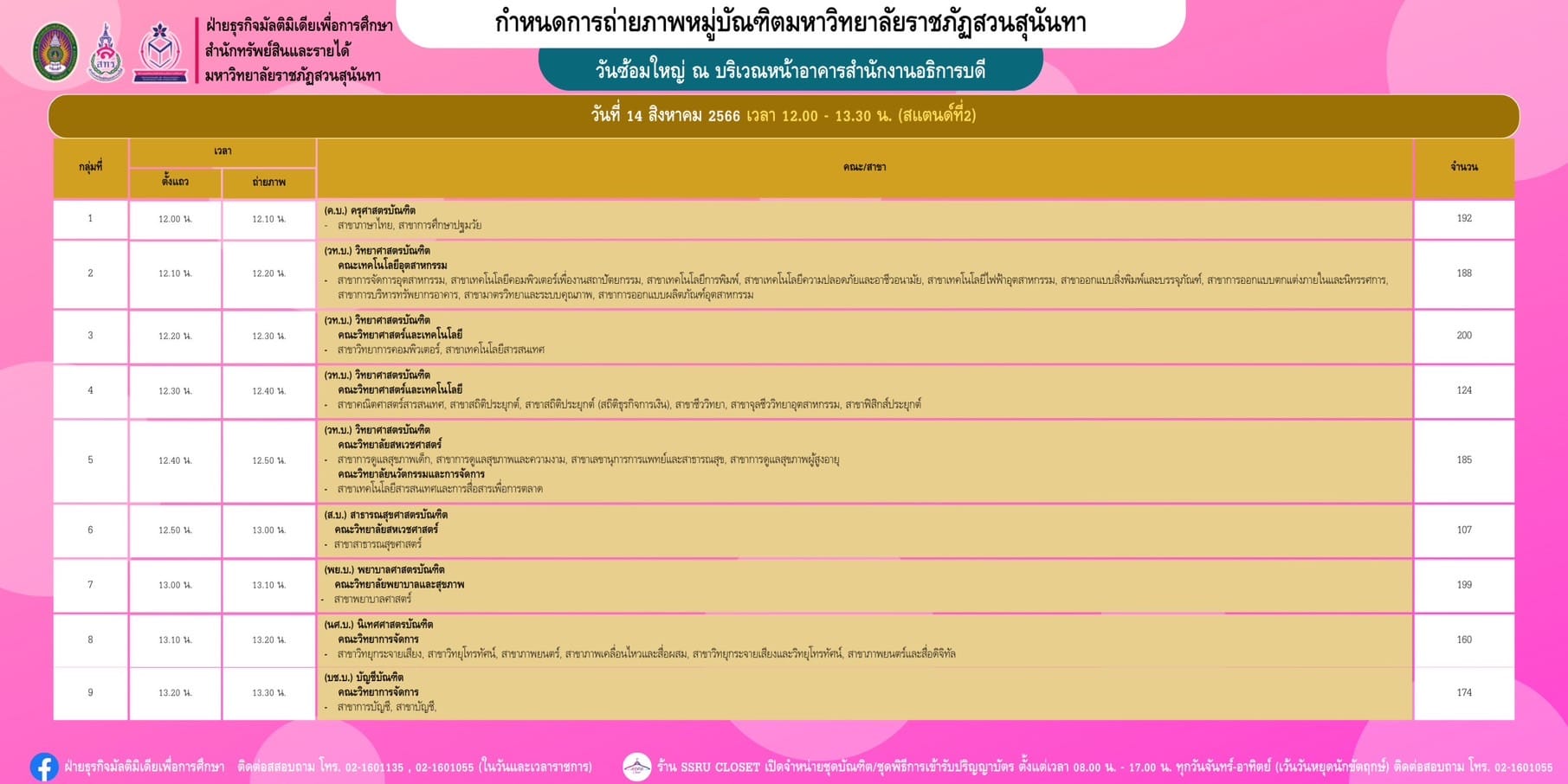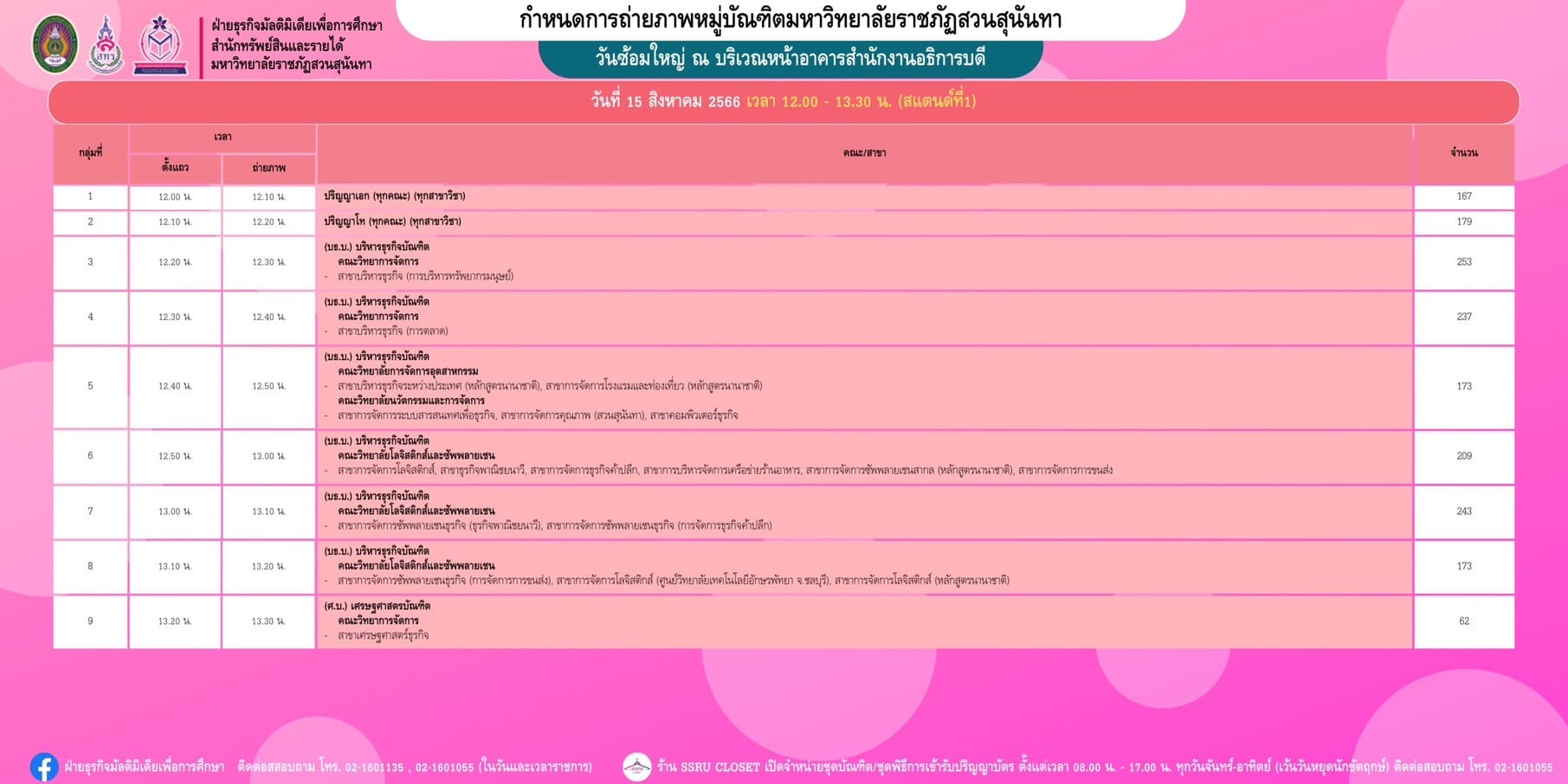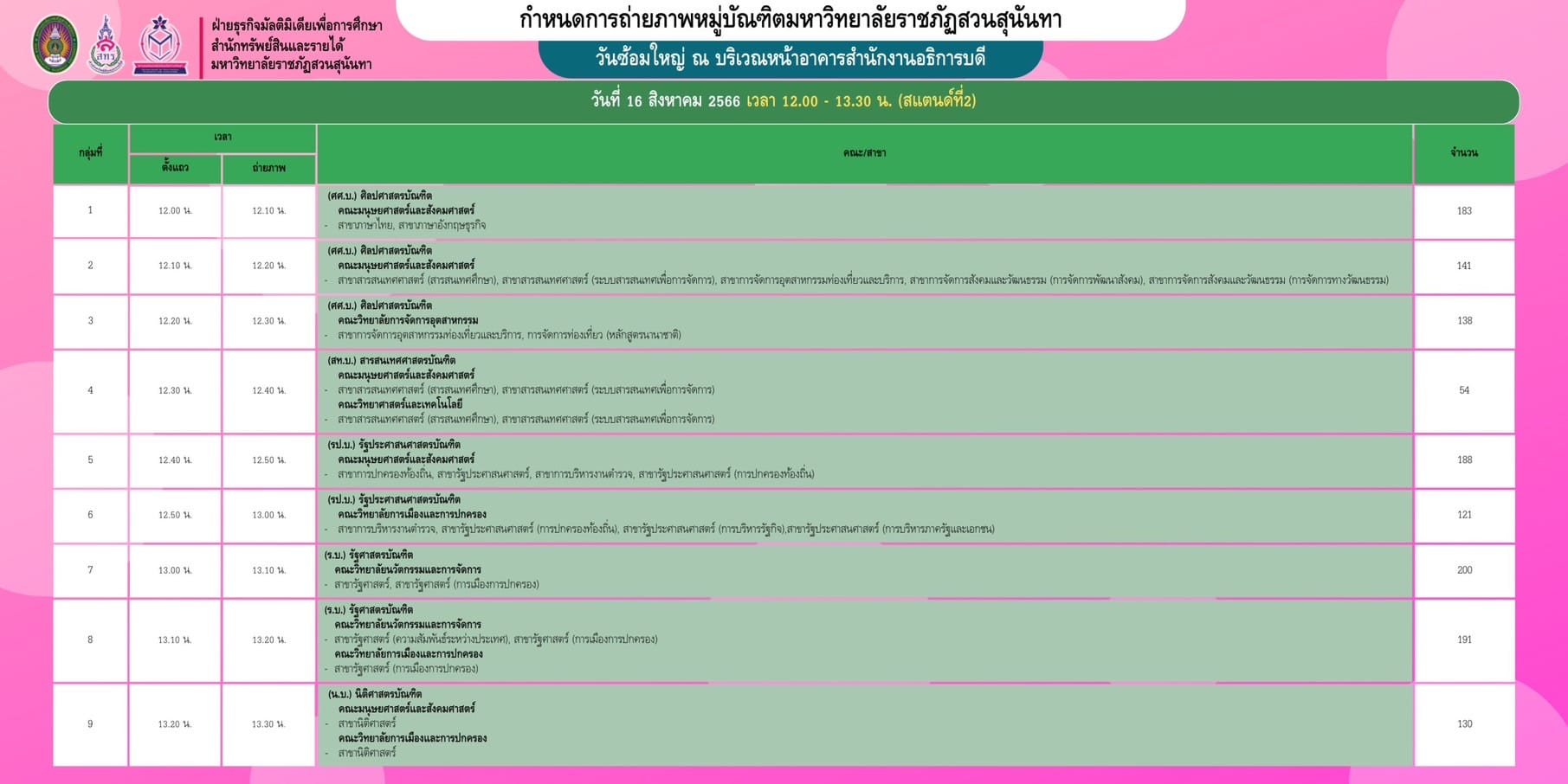 - การถ่ายภาพหมู่บัณฑิต บัณฑิตทุกคนต้องเข้าร่วม สำหรับบัณฑิตท่านใดที่ไม่ได้เข้าร่วมพิธีซ้อม สามารถมาในเวลาตั้งแถวตามตาราง