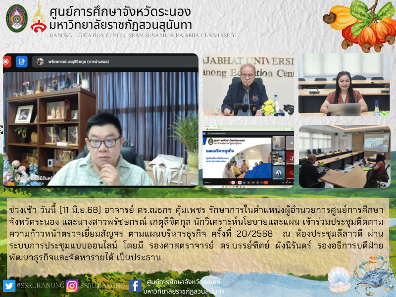 This morning (June 11, 2025), Dr. Nattakorn Kumphetch, acting director of the Ranong Provincial Educational Center, and Ms. Prachaskorn Ketulikitkul, a policy and planning analyst, attended a progress meeting on the 20th Business Management plan visit via online conference in the Lilawadee meeting room, chaired by Assoc. Prof. Dr. Banjit Phangnirang, vice president for business development and revenue generation.