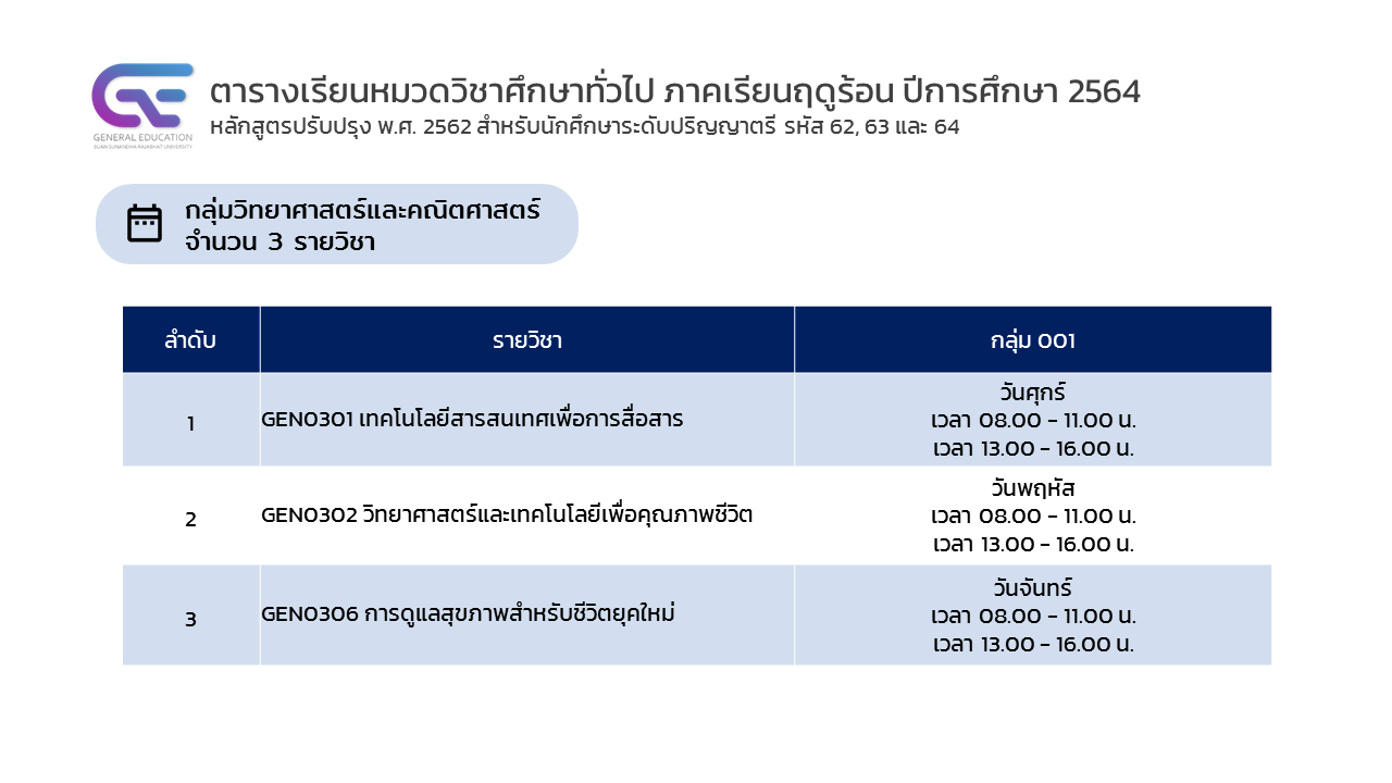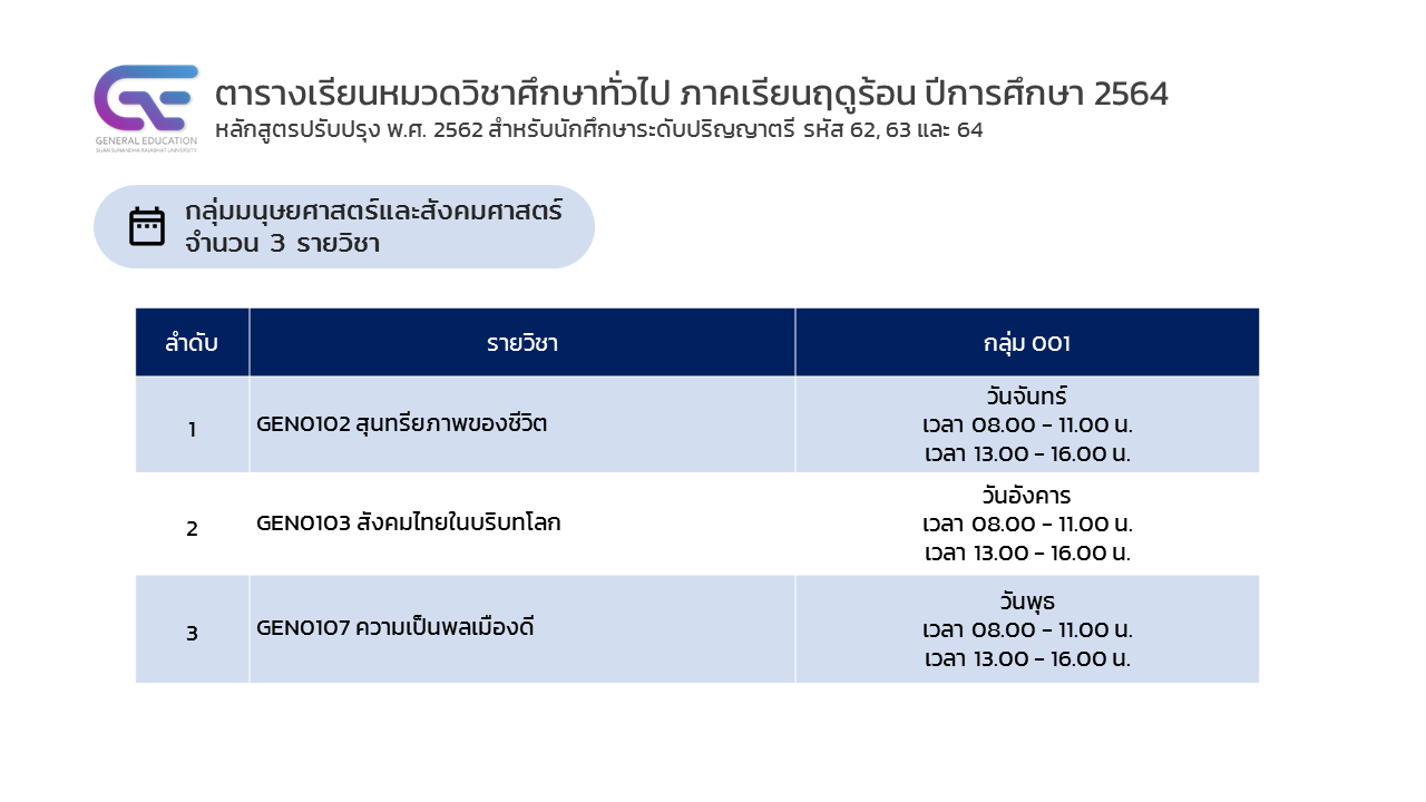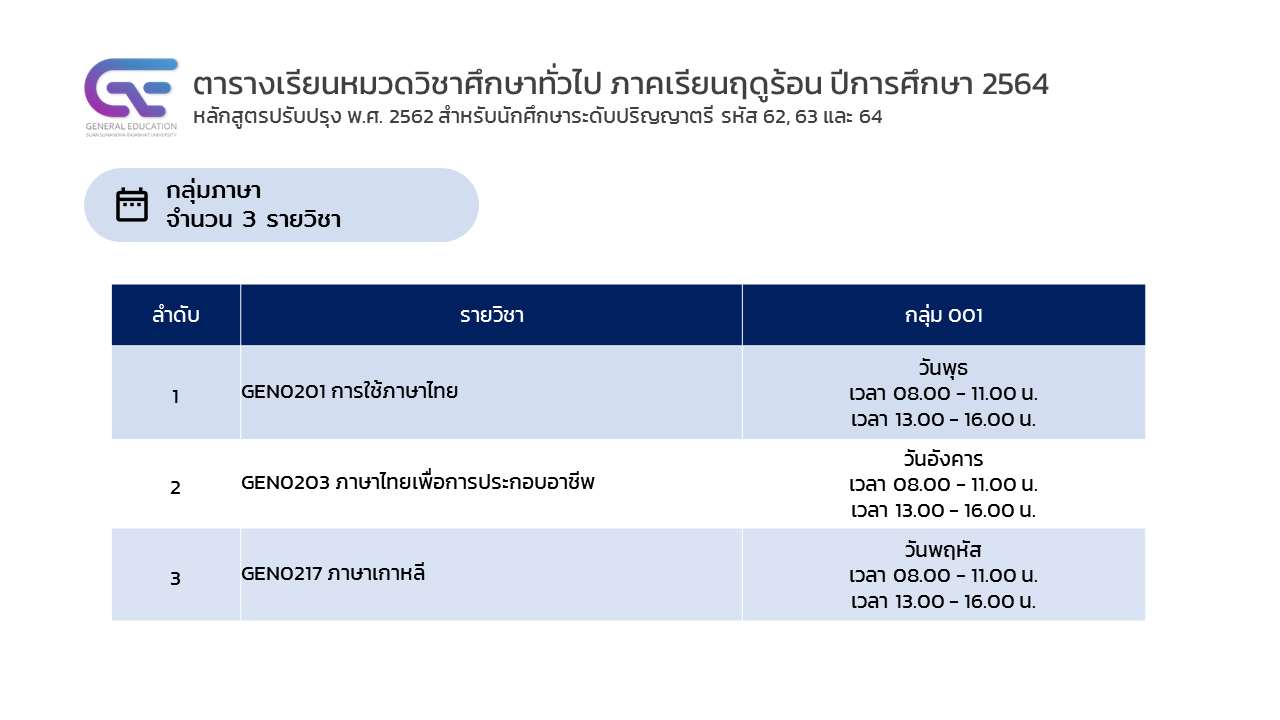ประกาศตารางเรียนหมวดวิชาศึกษาทั่วไป ภาคเรียนฤดูร้อน ปีการศึกษา 2564 (รูปแบบการเรียนการสอนออนไลน์)