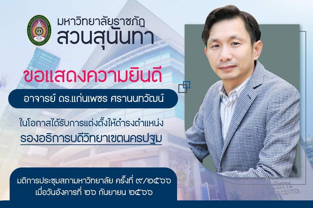 Congratulations to "Professor Dr. Kaenphet Saranontawat" On the occasion of being appointed to the position Vice President of Nakhon Pathom Campus Suan Sunandha Rajabhat University