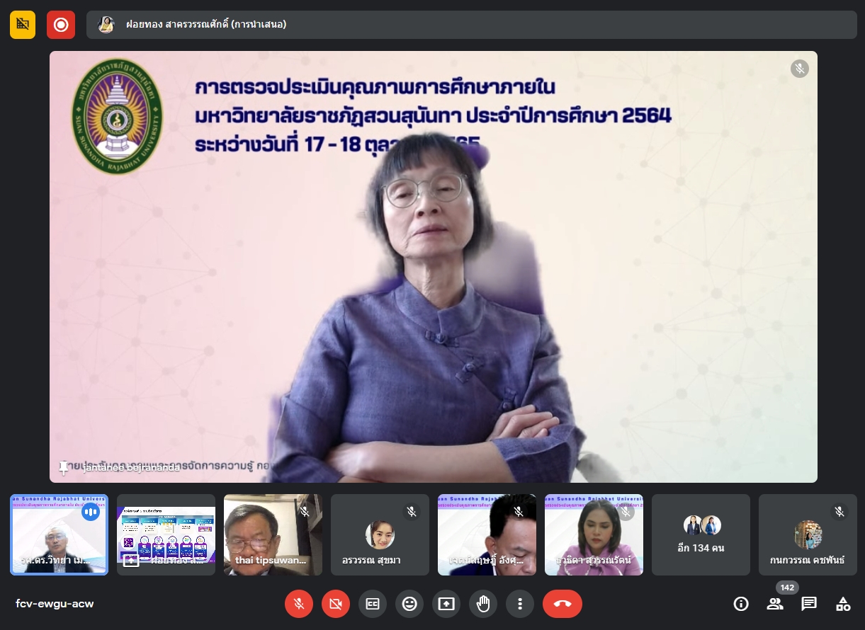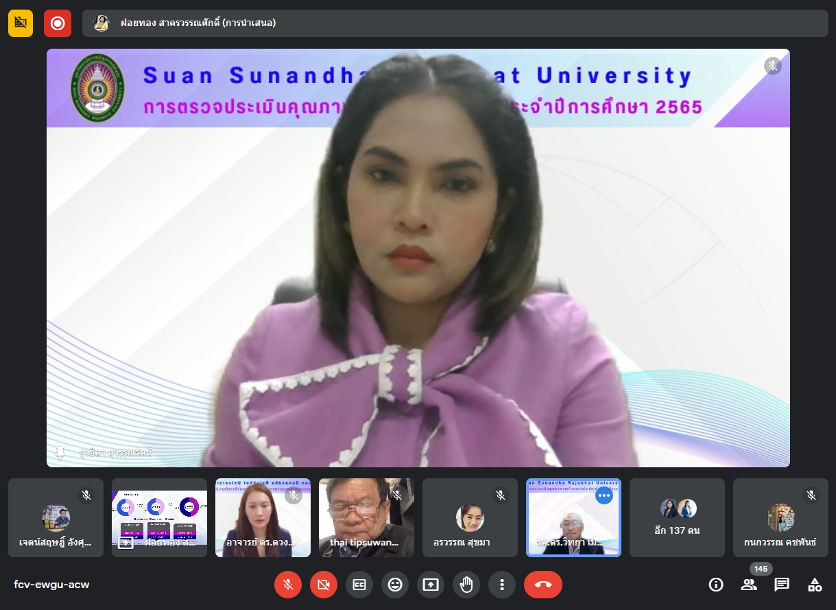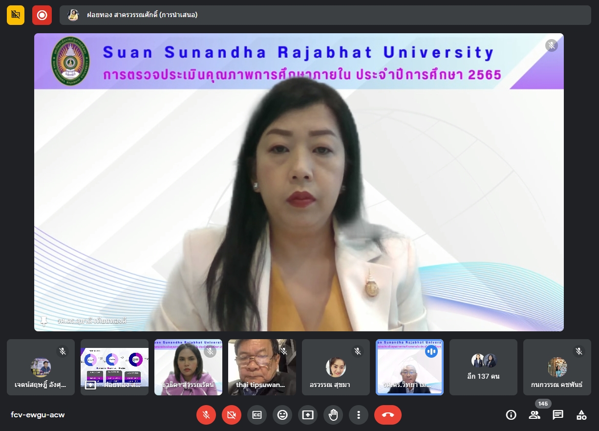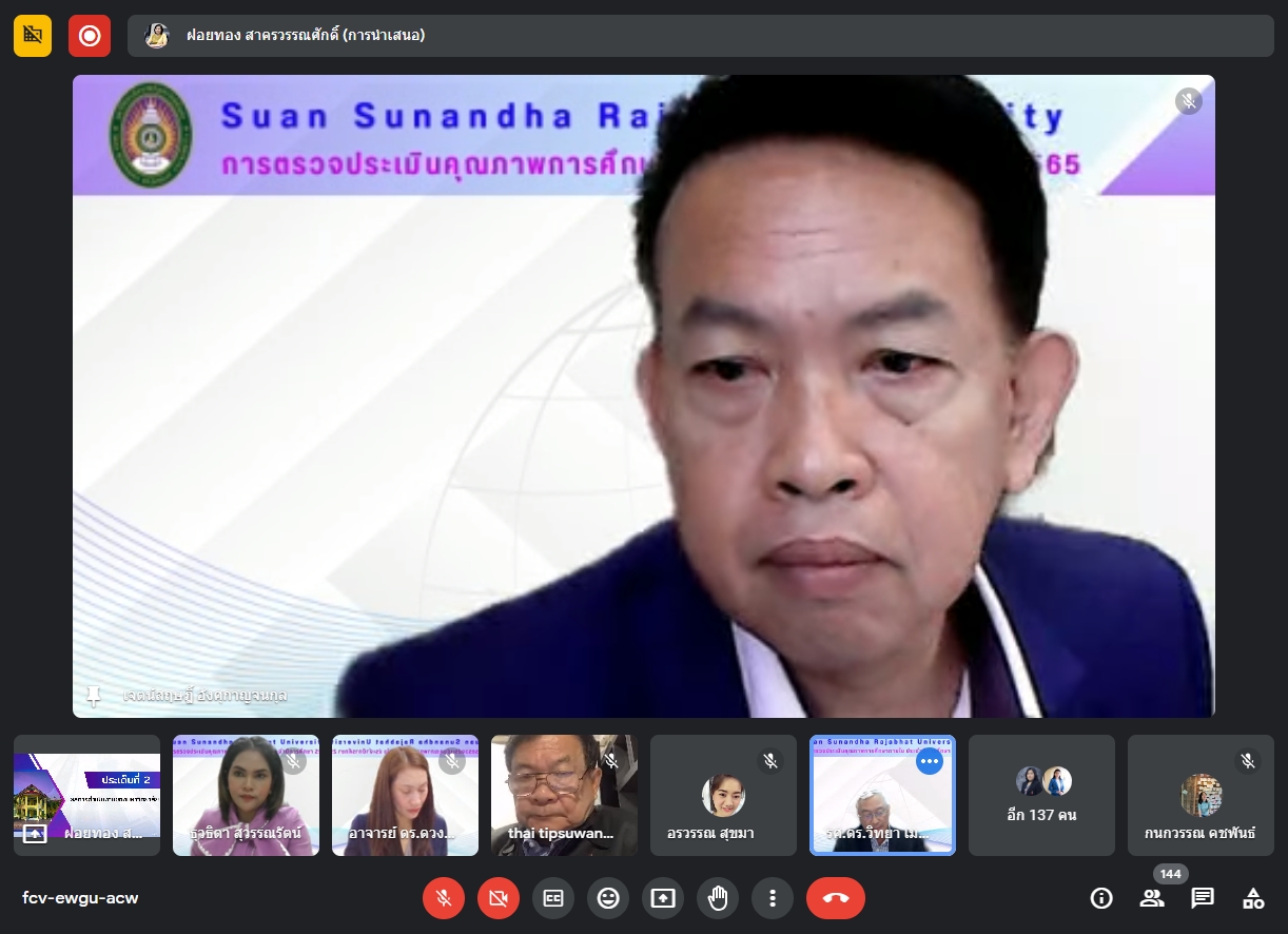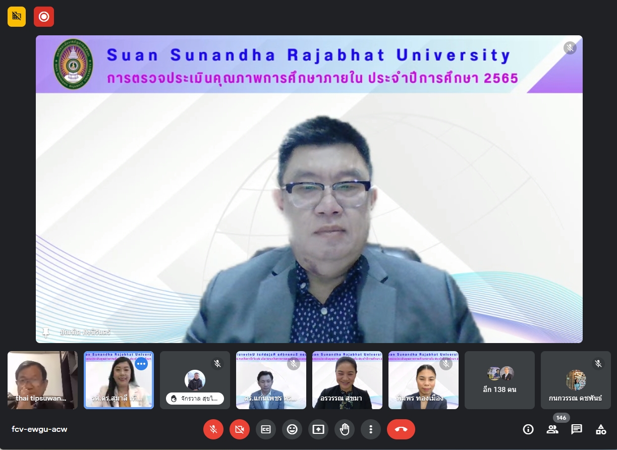 วันนี้ (16 ต.ค.66) เวลา  09.30  น. อาจารย์  ดร.สุวัฒน์  นวลขาว ผู้อำนวยการศูนย์การศึกษาจังหวัดระนอง เข้าร่วมการตรวจประเมินคุณภาพการศึกษาภายใน มหาวิทยาลัยราชภัฏสวนสุนันทา ประจำปีการศึกษา 2565 ระดับสถาบัน ระหว่างวันที่ 17 - 18 ตุลาคม 2566 ณ  ห้องประชุม A306  ศูนย์การศึกษาจังหวัดระนอง  ในรูปแบบออนไลน์ โปรแกรม Google Meet โดยมี รศ.ดร.ชุติกาญจน์  ศรีวิบูลย์ อธิการบดีมหาวิทยาลัยราชภัฏสวนสุนันทา กล่าวต้อนรับคณะกรรมการตรวจประเมินคุณภาพการศึกษาภายใน