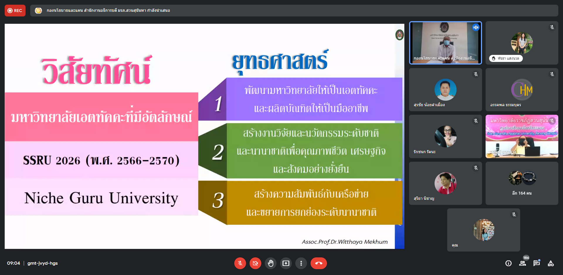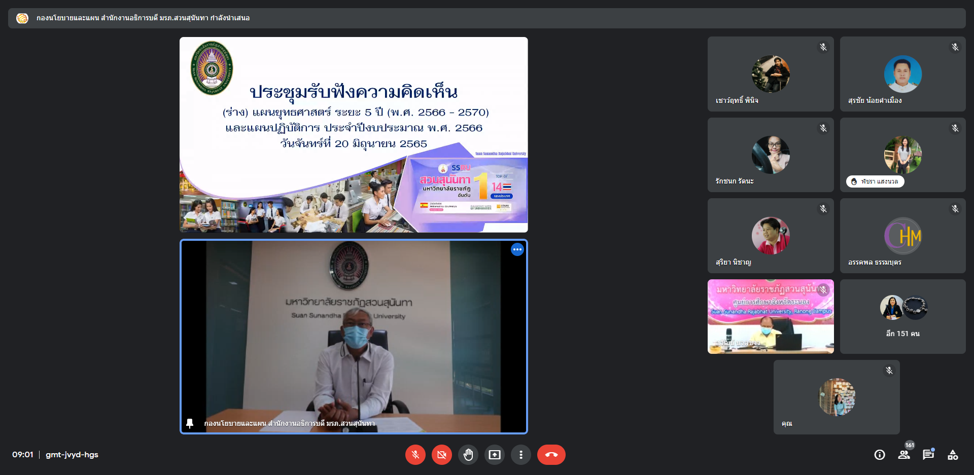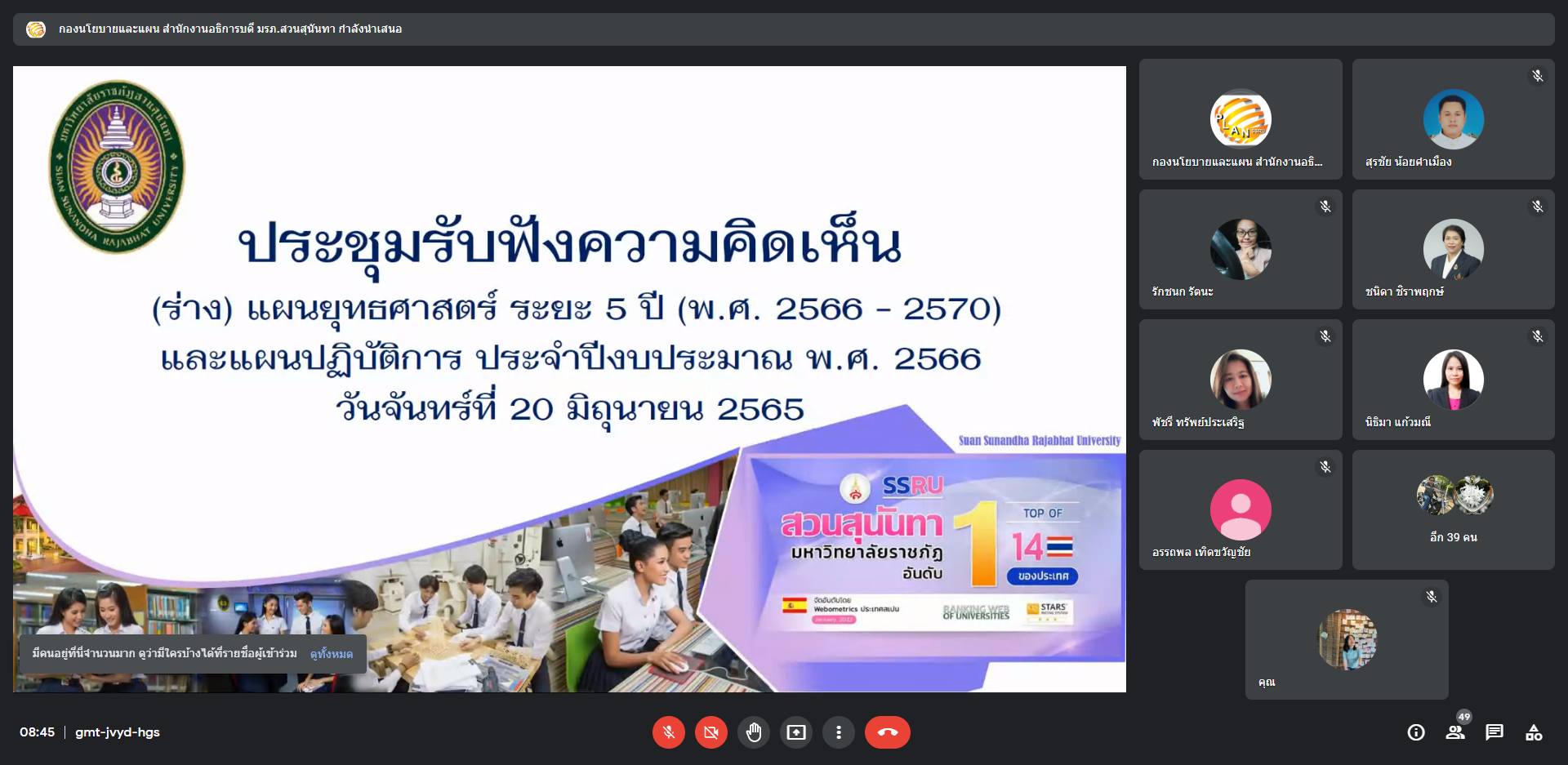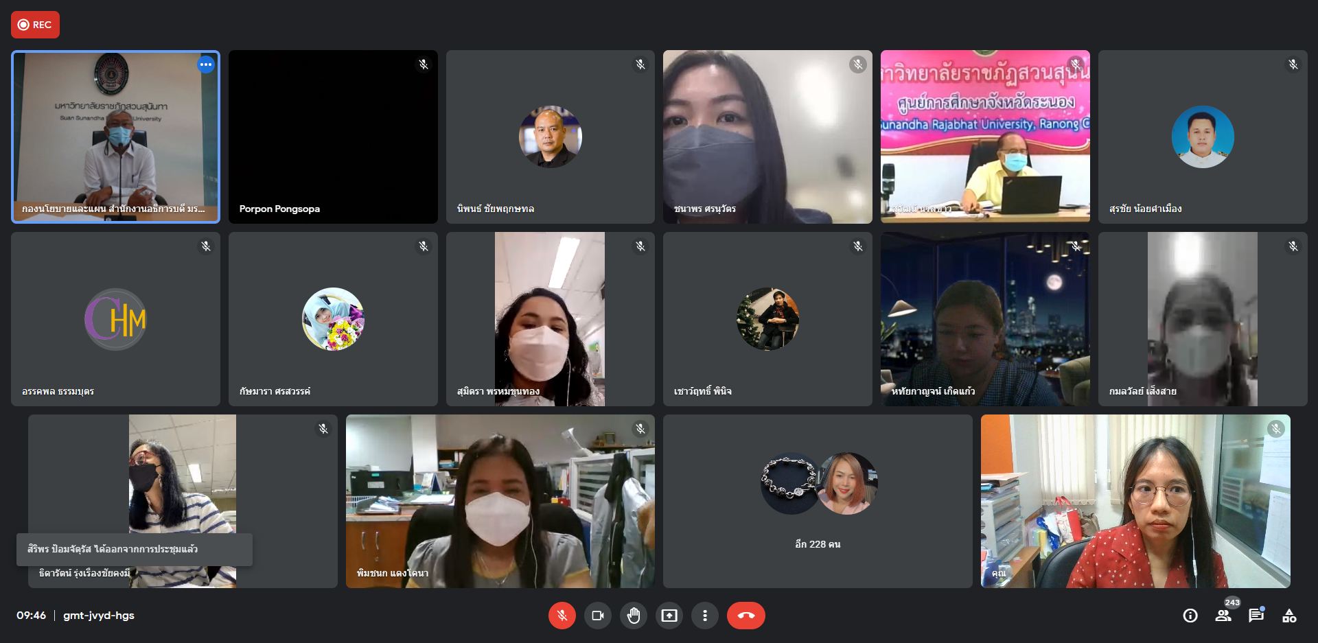 ช่วงเช้า วันที่ 20 มิถุนายน 2565 ดร.สุวัฒน์ นวลขาว ผู้อำนวยการศูนย์การศึกษาจังหวัดระนองและบุคลากรศูนย์ฯทุกคนเข้าร่วมประชุมรับฟังความคิดเห็น(ร่าง) แผนยุทธศาสตร์ ระยะ 5 ปี (พ.ศ. 2566 - 2570) และแผนปฏิบัติการ ประจำปีงบประมาณ พ.ศ. 2566 โดยมีรศ.ดร.วิทยา เมฆขำ รองอธิการบดีฝ่ายแผนงานและประกันคุณภาพเป็นประธาน โดยได้มีการได้มีเปิดโอกาสให้บุคลากรมีส่วนร่วมแสดงความคิดเห็นต่อทิศทางการพัฒนามหาวิทยาลัยตามสถานการณ์ปัจจุบันที่มีการเปลี่ยนแปลงอย่างรวดเร็ว