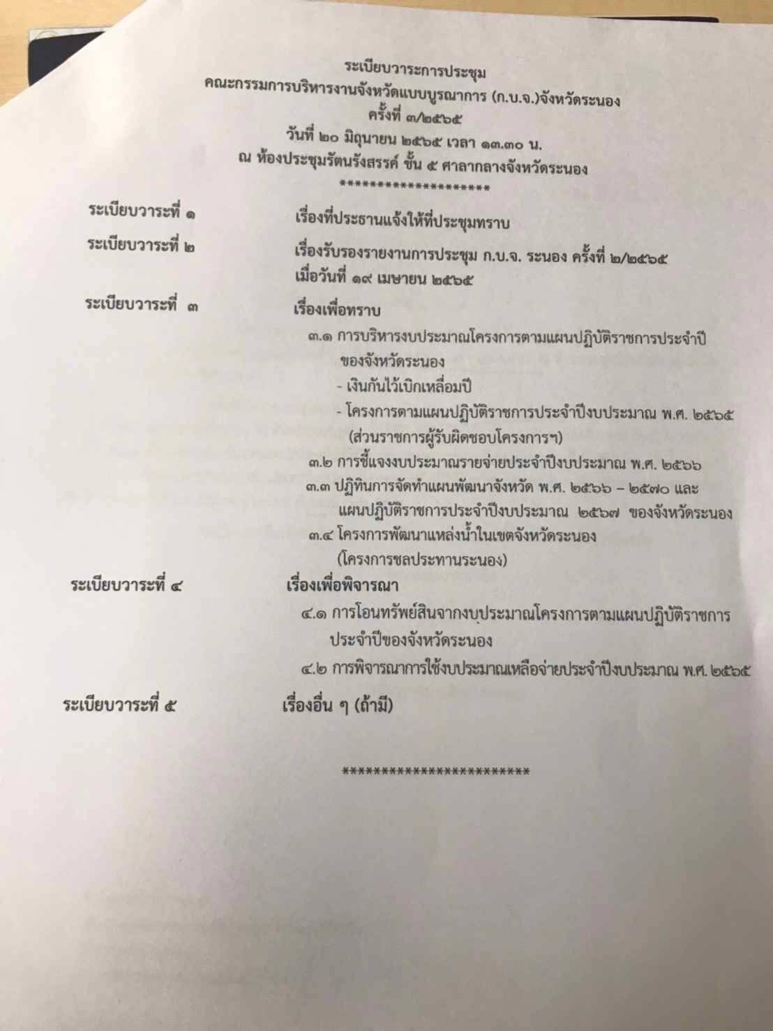 ช่วงบ่าย วันที่ 20 มิถุนายน 2565 ดร.สุวัฒน์ นวลขาว ผู้อำนวยการศูนย์การศึกษาจังหวัดระนองเข้าร่วมการประชุมคณะกรรมการบริหารงานจังหวัดแบบบูรณาการ (ก.บ.จ.) จังหวัดระนอง ครั้งที่ 3/2565 ณ ห้องประชุมรัตนรังสรรค์ ชั้น 5 ศาลากลางจังหวัดระนอง โดยมีวาระเพื่อพิจารณาการโอนทรัพย์สินจากงบประมาณโครงการตามแผนปฏิบัติราชการประจำปีของจังหวัดระนอง และการพิจารณาใช้งบประมาณเหลือจ่ายประจำปีงบประมาณ พ.ศ.2565