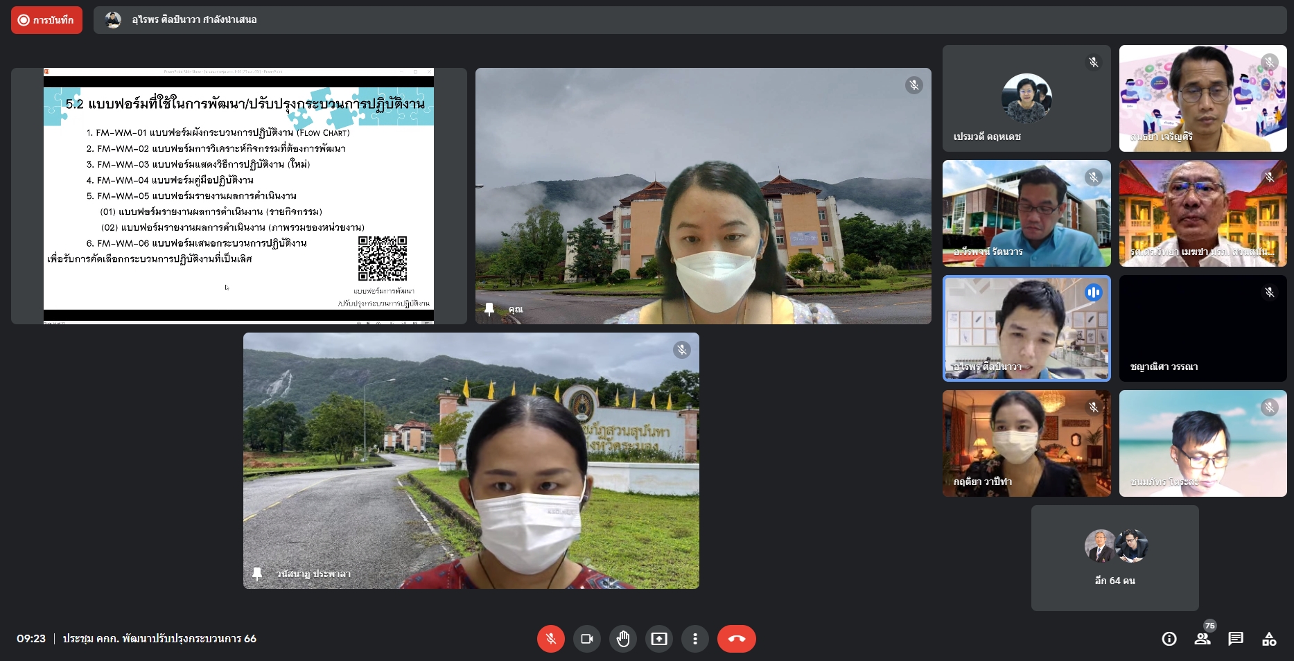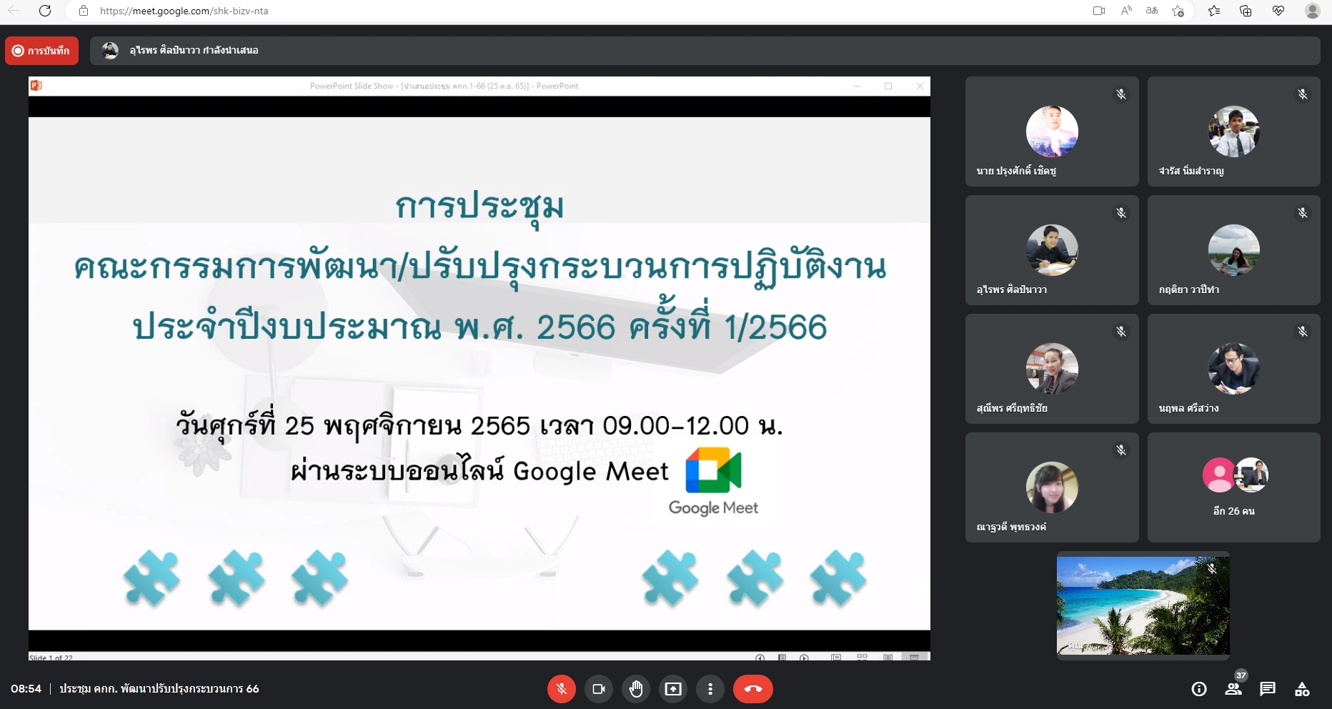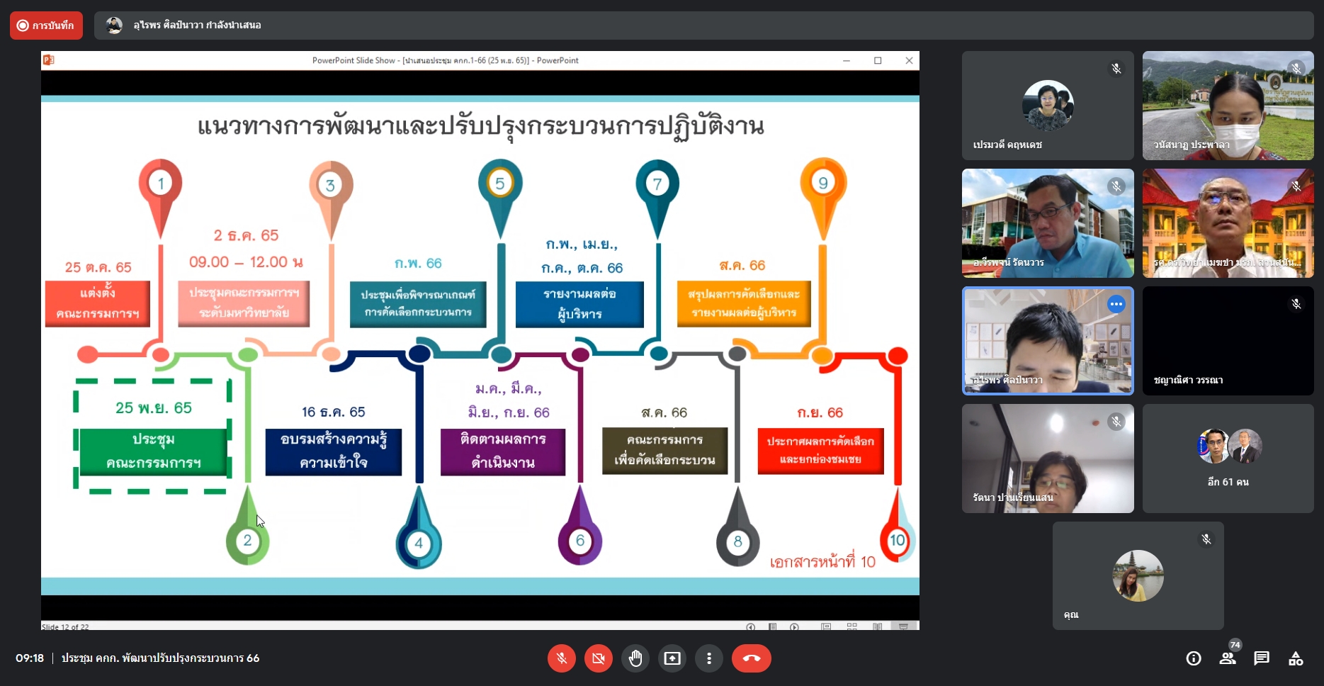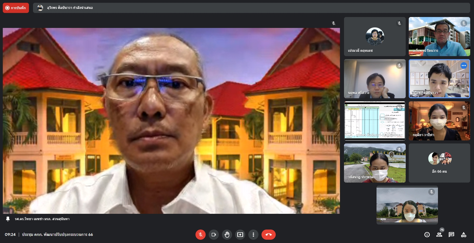 ช่วงเช้า วันนี้ ( 25 พ.ย.65 )นางสาววนัสนาฏประพาลา  รักษาการหัวหน้าสำนักงานศูนย์การศึกษาจังหวัดระนอง และนางสาวพรัชษกรณ์  เกตุลิขิตกุล นักวิเคราะห์นโยบายและแผน เข้าร่วมการประชุมคณะกรรมการพัฒนา/ปรับปรุงกระบวนการปฏิบัติงาน  ประจำปีงบประมาณ พ.ศ. 2566 ครั้งที่ 1/2566 ร่วมกับกองนโยบายและแผน ผ่านระบบออนไลน์ Google meet โดยมีรศ.ดร.วิทยา  เมฆขำ  รองอธิการบดีฝ่ายแผนงานและประกันคุณภาพ เป็นประธาน