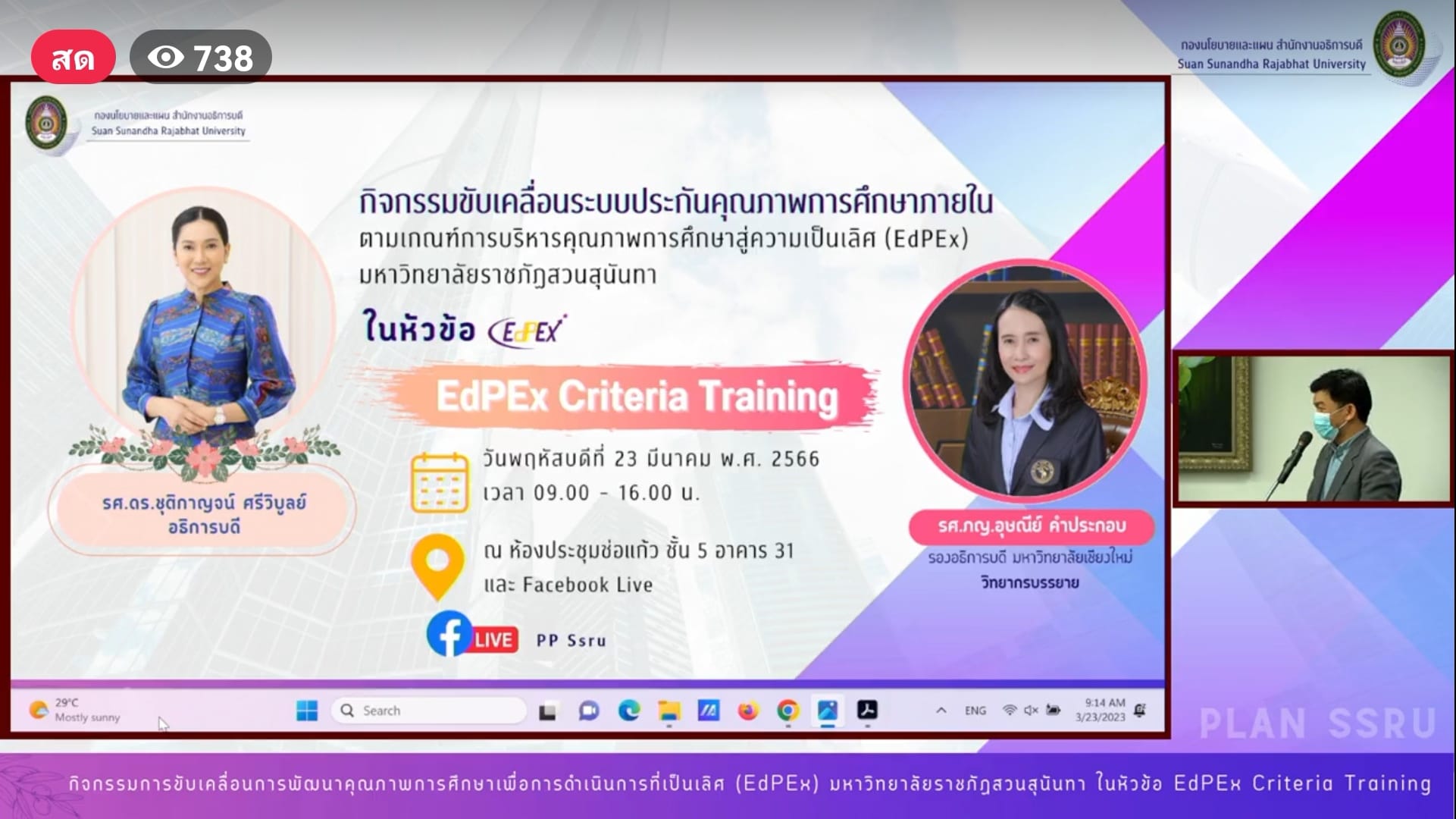 In the morning (March 23, 2023), Dr. Suwat Nuankhao, Director of the Ranong Education Center and personnel of the Ranong Education Center participated in the activities to drive education quality development for operational excellence (EdPEx) Suan Sunandha Rajabhat University on the topic of EdPEx Criteria Training, which was honored by Associate Professor Pharmacist Ying Usanee Khamprakob, Vice President of Chiang Mai University, was a speaker via Facebook Live.