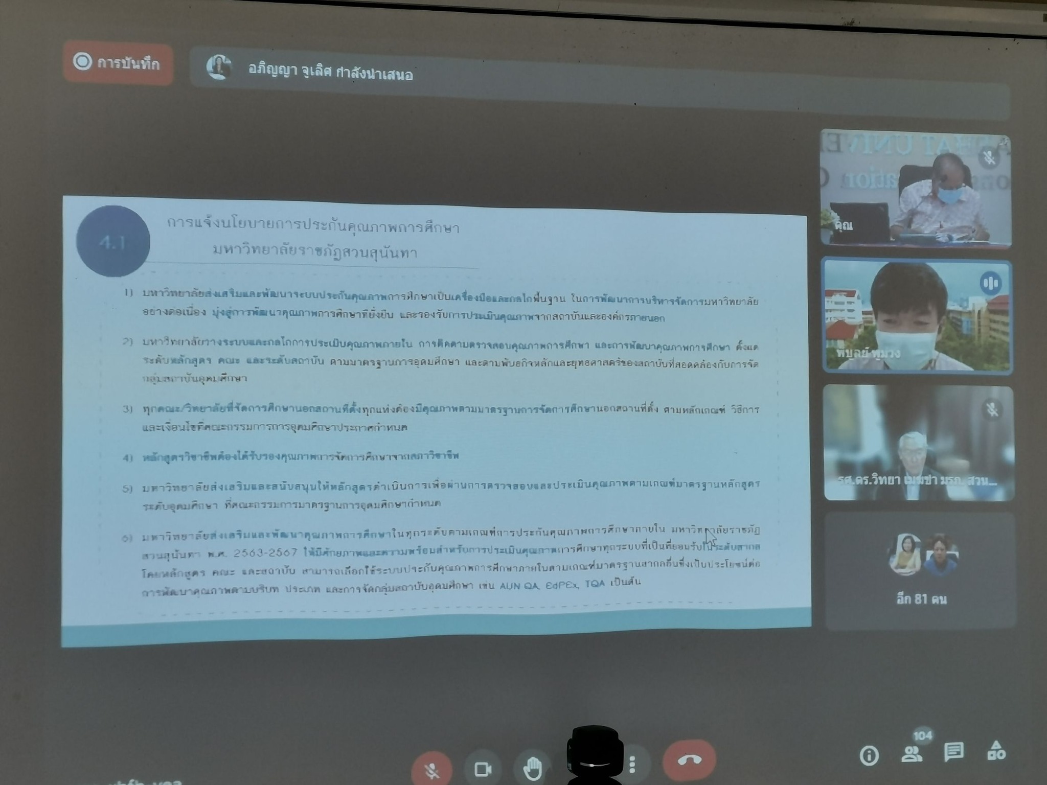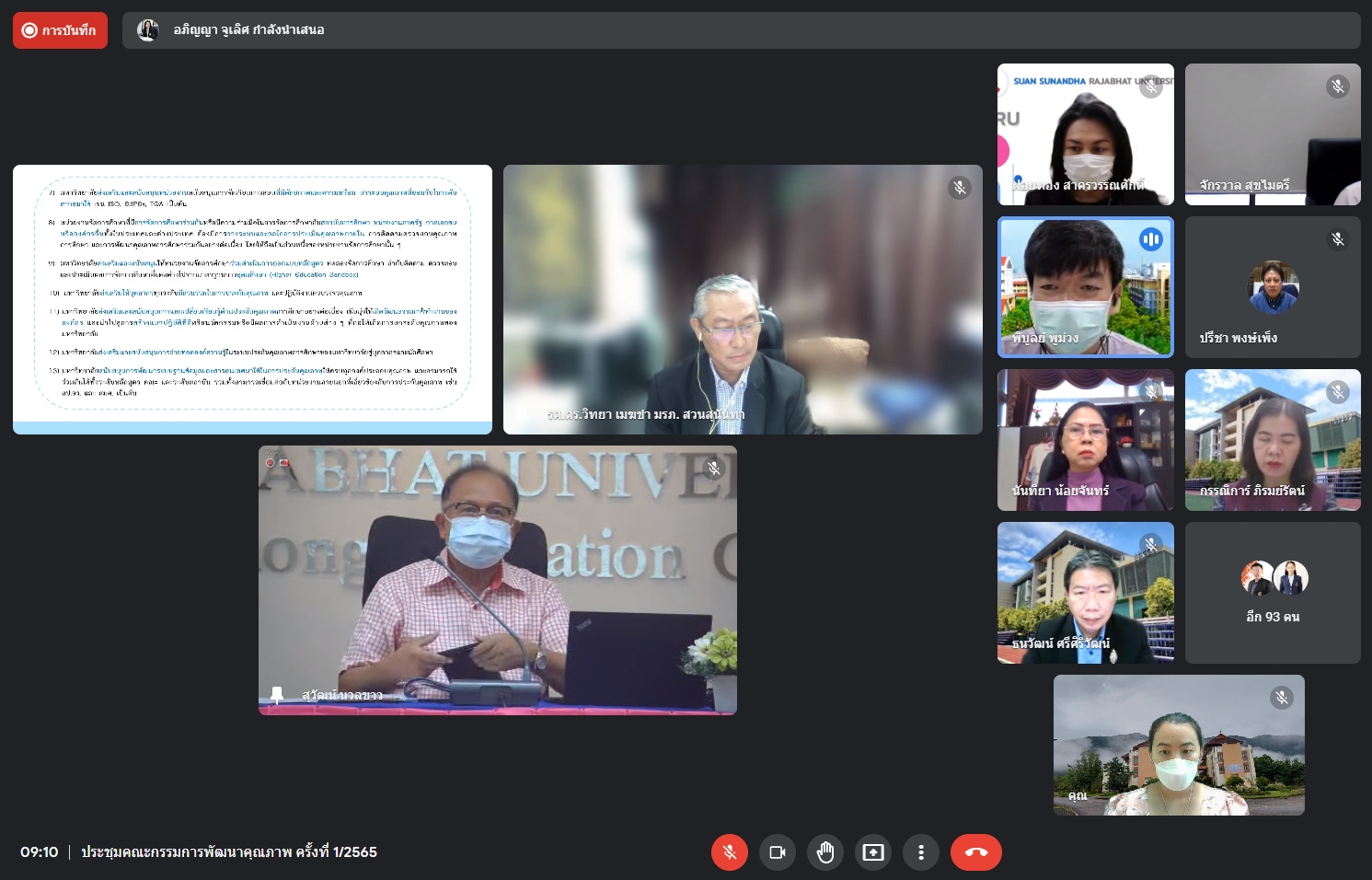 ช่วงเช้า วันที่ 29 พฤศจิกายน 2565 อาจารย์ ดร.สุวัฒน์ นวลขาว ผู้อำนวยการศูนย์การศึกษาจังหวัดระนอง เข้าร่วมการประชุมคณะกรรมการพัฒนาคุณภาพ มหาวิทยาลัยราชภัฏสวนสุนันทา ประจำปีการศึกษา 2565 ครั้งที่ 1/2565 ผ่านระบบการประชุมออนไลน์ ณ ห้องประชุม A306 โดยมีรศ.ดร.วิทยา เมฆขำ รองอธิการบดีฝ่ายนโยบายและแผนเป็นประธาน มีรวาระเพื่อพิจารณา จำนวน 3 เรื่อง ได้แก่