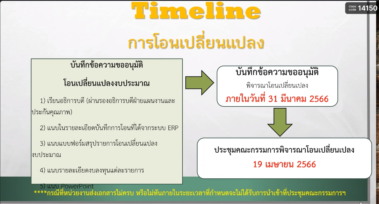 ช่วงเช้า วันนี้(20 ก.พ.66) นางสาวพรัชษกรณ์ เกตุลิขิตกุล นักวิเคราะห์นโยบายและแผน เข้าร่วมประชุมชี้แจ้งแนวทางการขออนุมัติโอนเปลี่ยนแปลง(งบลงทุน) เพื่อชี้แจ้งแบบฟอร์ม และขั้นตอนการขออนุมัติโอนเปลี่ยนแปลง(งบลงทุน )ผ่านระบบ Google meet