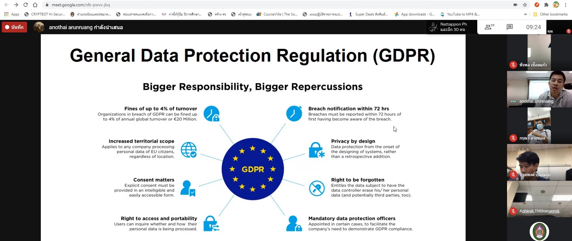 ช่วงเช้า วันที่ 2 มีนาคม 2564 นางสาวกนกวรรณ คชพันธ์ นักวิชาการศึกษา เข้าร่วมการอบรมเรื่อง 'การป้องกันภัยคุกคามด้านข้อมูลส่วนบุคคล (PDPA)' เพื่อสร้างความรู้ความเข้าใจเกี่ยวกับการป้องกันภัยคุกคามด้านข้อมูลส่วนบุคคล เพื่อหลีกเลี่ยงการละเมิดสิทธิทั้งโดยเจตนาและไม่เจตนา ลดความเสียหายที่จะเกิดขึ้นในองค์กร ผ่านทางระบบออนไลน์ Google Meet จัดโดยศูนย์เทคโนโลยีสารสนเทศ สำนักวิทยบริการและเทคโนโลยีสารสนเทศ