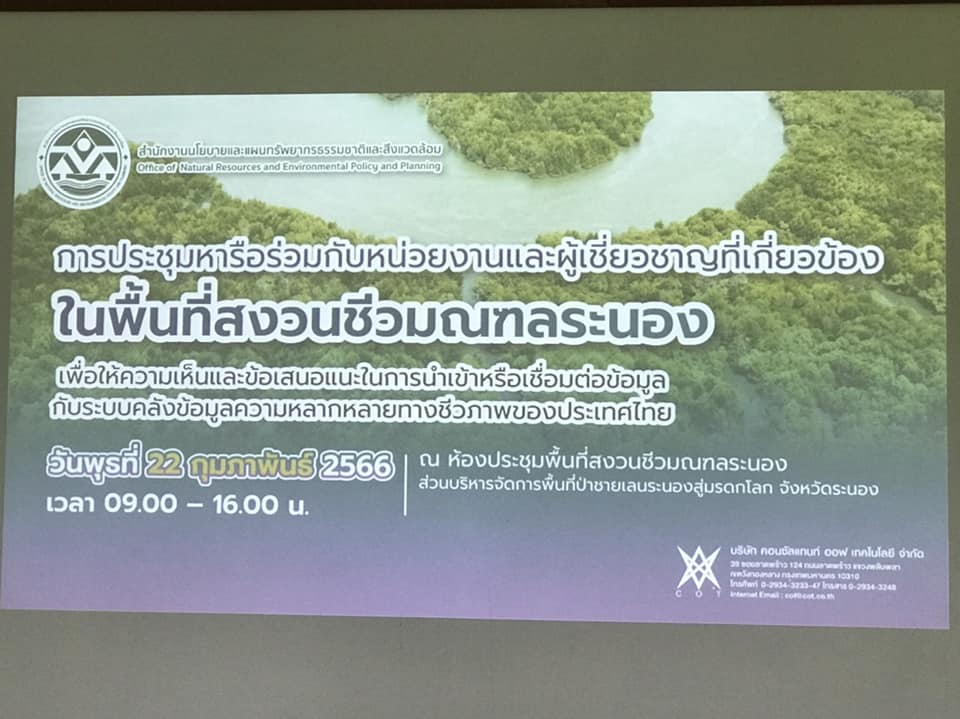 มีวัตถุประสงค์เพื่อหารือร่วมกับหน่วยงานและผู้เชี่ยวชาญที่เกี่ยวข้องในพื้นที่ และรับฟังข้อเสนอแนะในการพัฒนาระบบต้นแบบพื้นที่นำร่อง การนำเข้าหรือเชื่อมต่อข้อมูลกับระบบคลังข้อมูลความหลากหลายทางชีวภาพของประเทศไทย เพื่อตอบสนองความต้องการในการบริหารจัดการเชิงพื้นที่