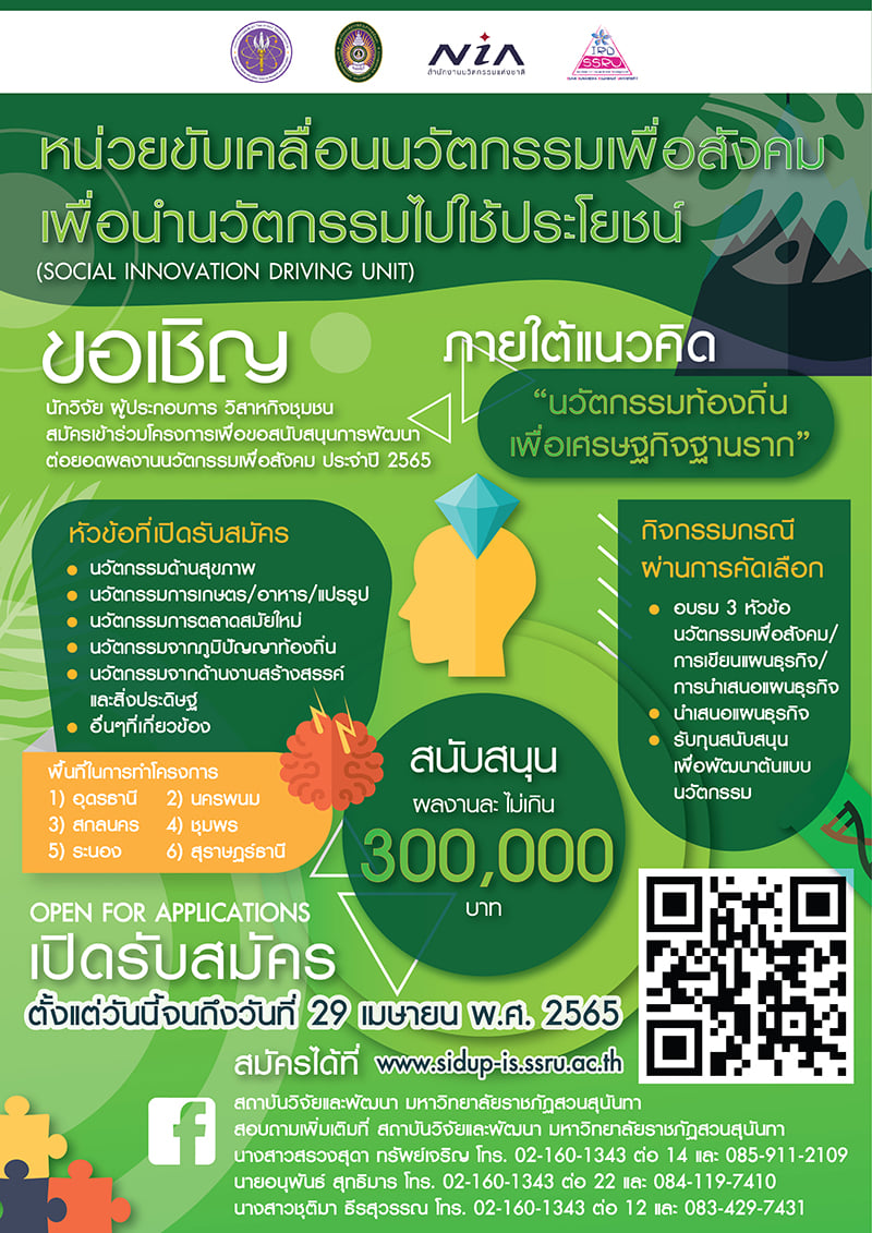 หน่วยขับเคลื่อนนวัตกรรมเพื่อสังคมเพื่อนำนวัตกรรมไปใช้ประโยชน์ ขอเชิญนักวิจัย ผู้ประกอบการ วิสาหกิจชุมชน สมัครเข้าร่วมโครงการเพื่อขอสนับสนุนการพัฒนาต่อยอดผลงานนวัตกรรมเพื่อสังคม ประจำปี 2565