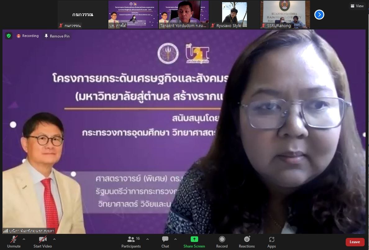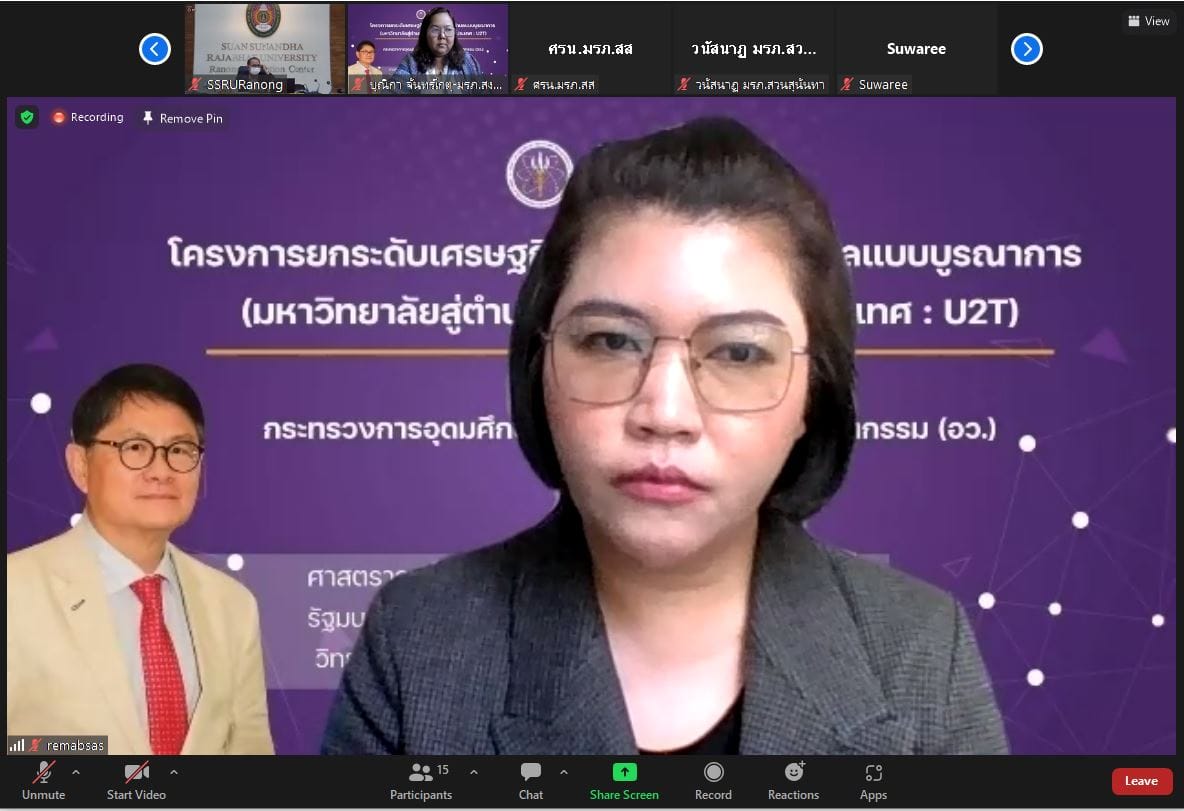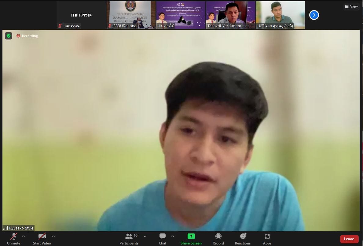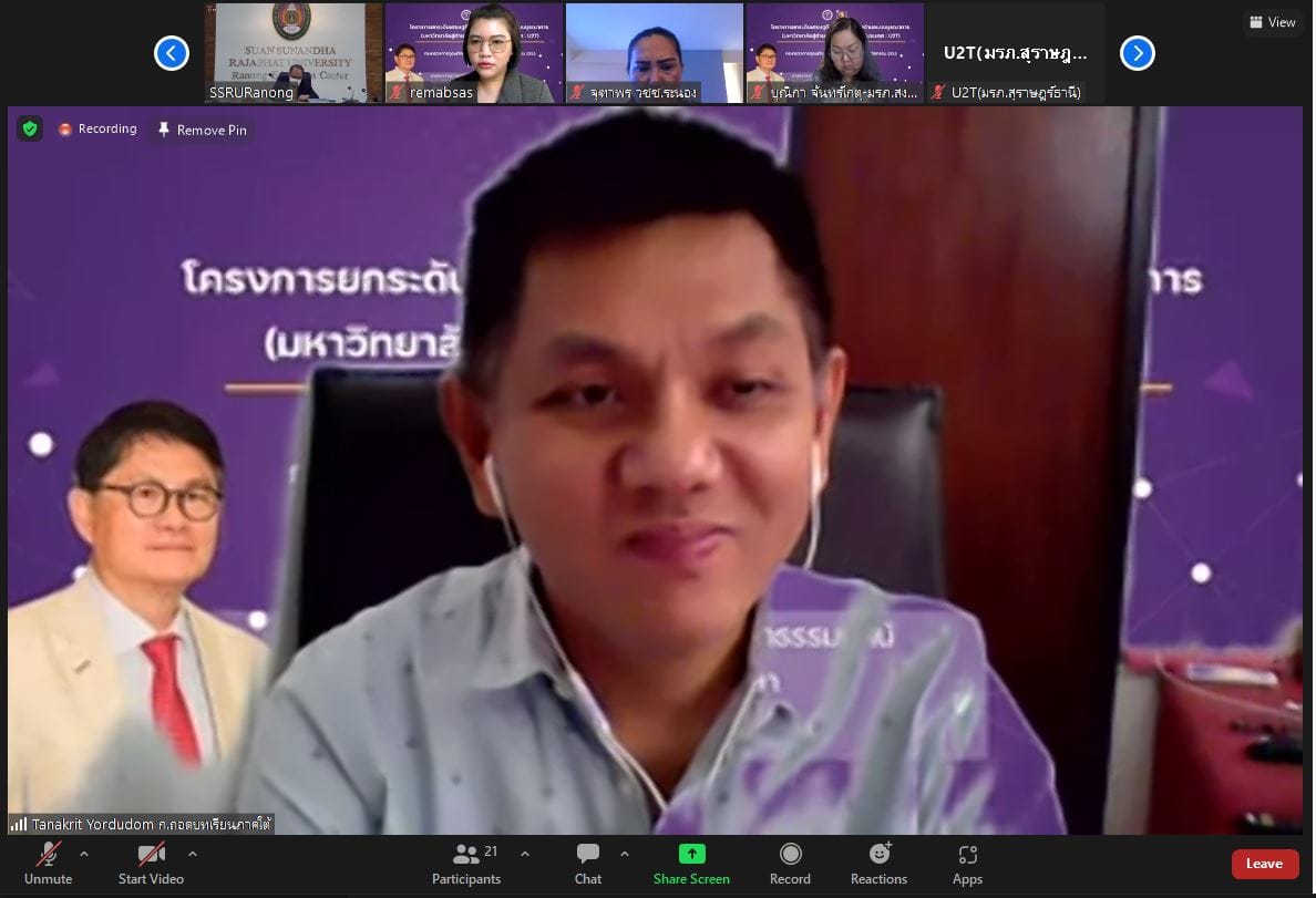 ช่วงเช้า วันที่ 9 มิถุนายน 2565 ดร.สุวัฒน์ นวลขาว ผู้อำนวยการศูนย์การศึกษาจังหวัดระนอง เข้าร่วมการประชุมเชิงปฏิบัติการเรื่อง "ถอดบทเรียนโครงการ U2T ประจำปีงบประมาณ พ.ศ.2564 พื้นที่จังหวัดระนอง" ณ ห้องประชุมA306ศูนย์การศึกษาจังหวัดระนอง มหาวิทยาลัยราชภัฏสวนสุนันทา โดยมีสถาบันการศึกษาที่ดำเนินงานโครงการ U2T ในพื้นที่จังหวัดระนองเข้าร่วมและนำเสนอการรายงานผลการดำเนินงานโครงการ U2Tในพื้นที่จังหวัดระนอง ได้แก่ มหาวิทยาลัยราชภัฏสุราษฎร์ธานี มหาวิทยาลัยเกษตรศาสตร์ และวิทยาลัยชุมชนระนอง