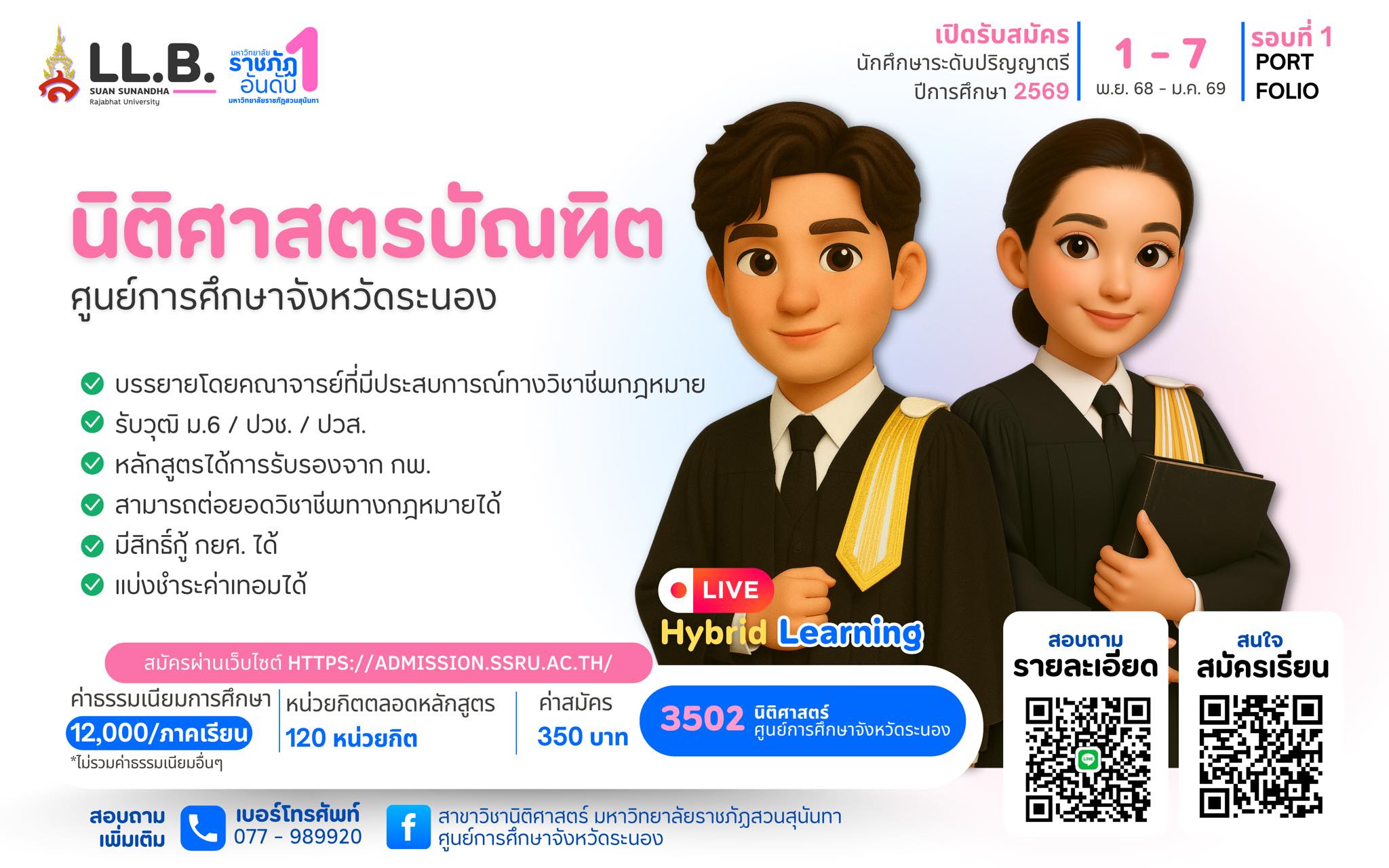 Facebook: สาขาวิชานิติศาสตร์ มหาวิทยาลัยราชภัฏสวนสุนันทา ศูนย์การศึกษาจังหวัดระนอง