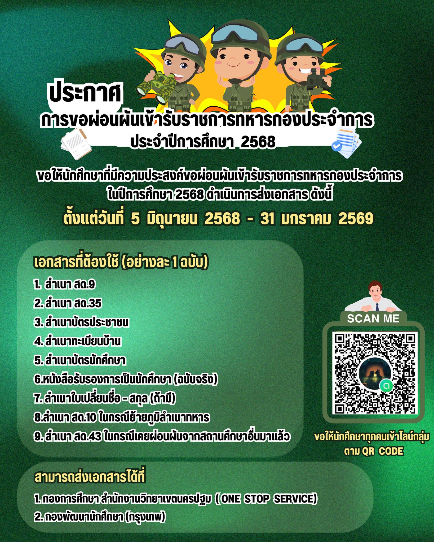 ส่งเอกสารผ่อนผันเกณฑ์ทหาร ประจำปีการศึกษา 2568 ภายใน (31 ม.ค. 68) นี้