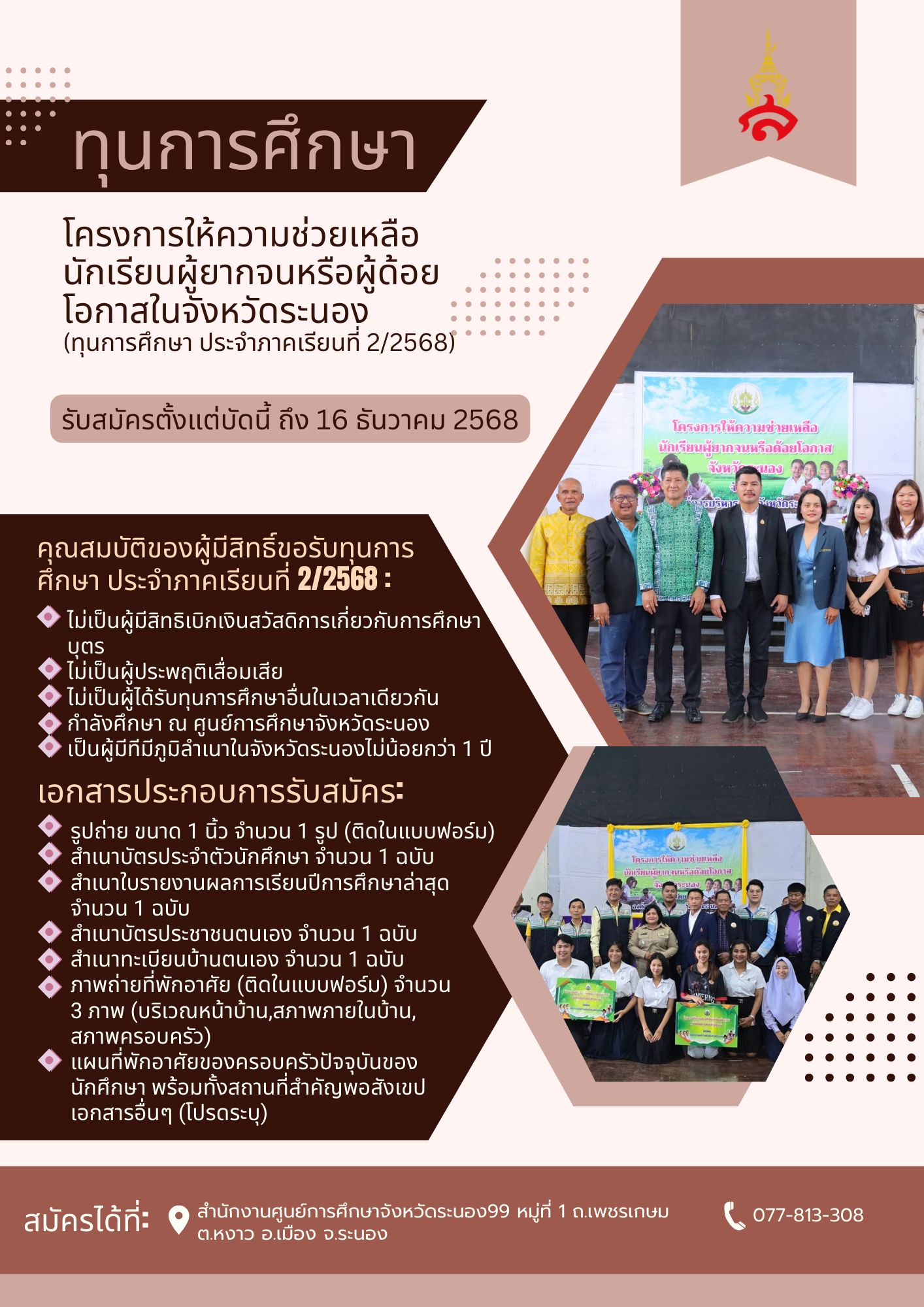 องค์การบริหารส่วนจังหวัดระนอง ได้จัดโครงการให้ความช่วยเหลือนักเรียนผู้ยากจนหรือผู้ด้อยโอกาสในจังหวัดระนอง (ทุนการศึกษา ประจำภาคเรียนที่ 2/2568)