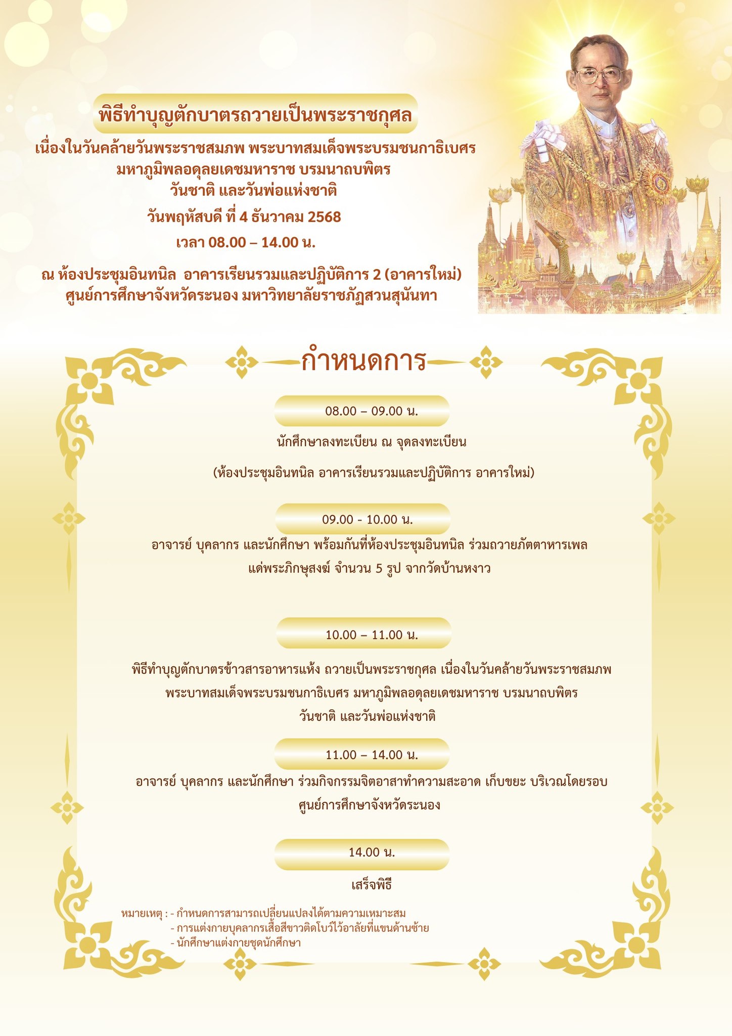 ศูนย์การศึกษาจังหวัดระนอง ขอเรียนเชิญผู้บริหาร คณาจารย์ บุคลากร และนักศึกษา ร่วมพิธีทำบุญตักบาตรถวายเป็นพระราชกุศลเนื่องในวันคล้ายวันพระราชสมภพ พระบาทสมเด็จพระบรมชนกาธิเบศร มหาภูมิพลอดุลยเดชมหาราช บรมนาถบพิตร