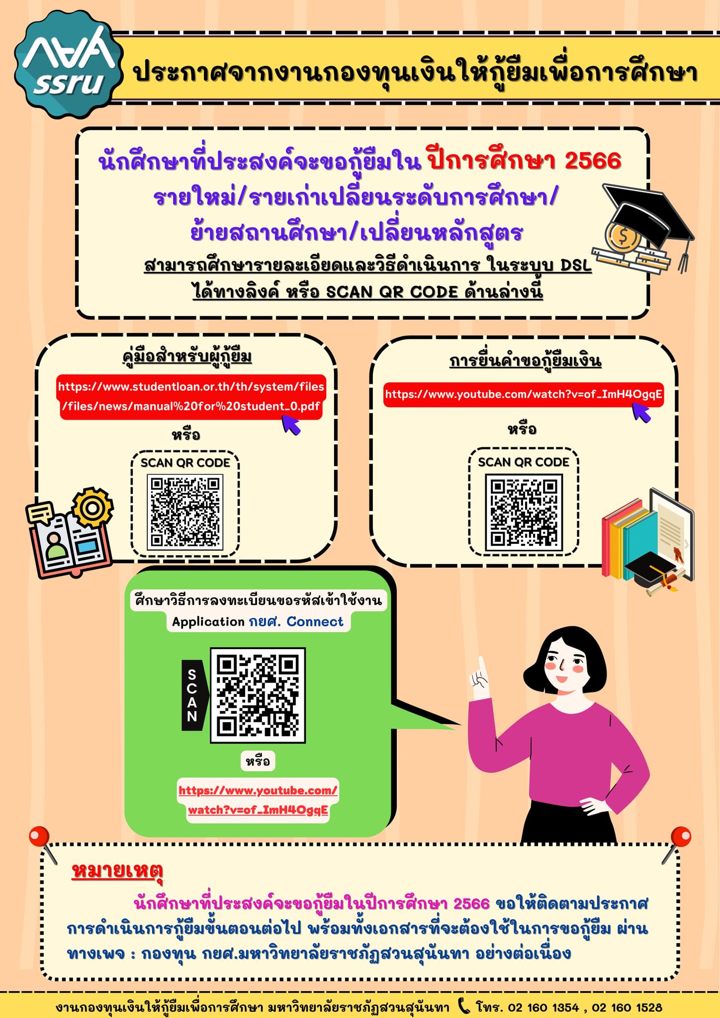 นักศึกษาที่ประสงค์จะขอกู้ยืมในปีการศึกษา 2566 ขอให้ติดตามประกาศการดำเนินการกู้ยืมขั้นตอนต่อไป พร้อมทั้งเอกสารที่จะต้องใช้ในการขอกู้ยืม ผ่านทางเพจกองทุน กยศ.มหาวิทยาลัยราชภัฏสวนสุนันทา อย่างต่อเนื่อง