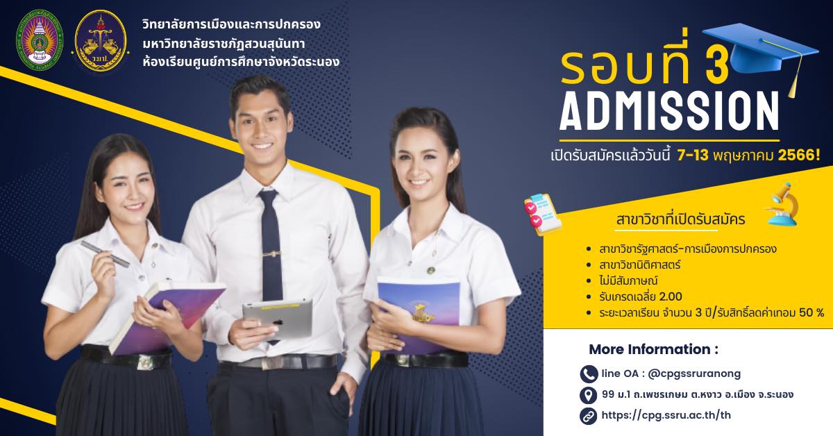 วิทยาลัยการเมืองและการปกครอง ห้องเรียนศูนย์การศึกษาจังหวัดระนอง มหาวิทยาลัยราชภัฏสวนสุนันทา เปิดรับสมัครนักศึกษา ภาคปกติ ระดับปริญญาตรี ประจำปีการศึกษา 2566