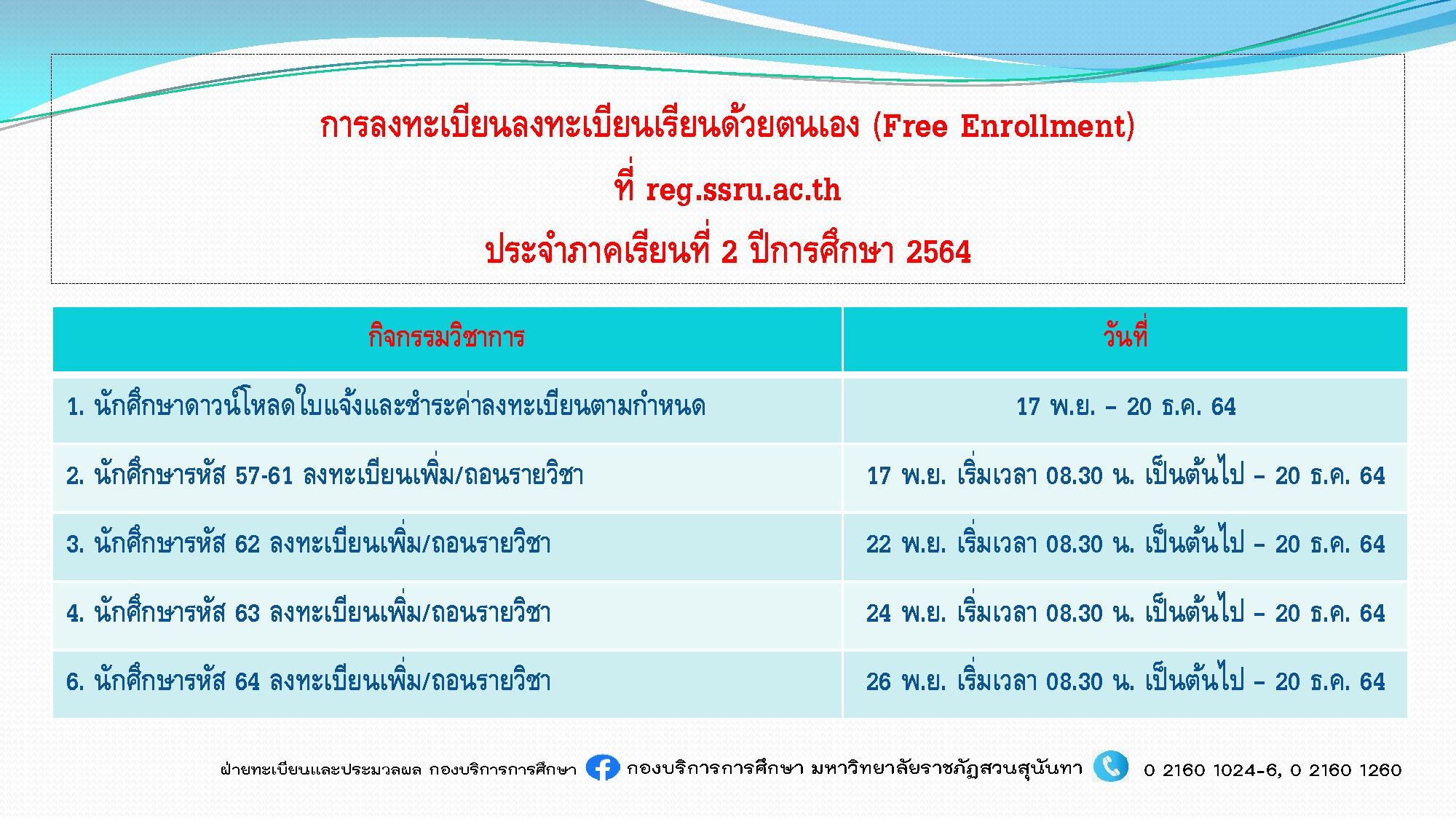 กำหนดการลงทะเบียนด้วยตนเอง (Free Enrollment) ที่ reg.ssru.ac.th ประจำภาคเรียนที่ 2 ปีการศึกษา 2564