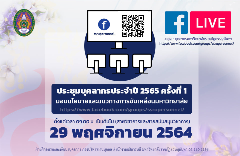 มหาวิทยาลัยราชภัฏสวนสุนันทากำหนดจัดการประชุม บุคลากรสายวิชาการ และสายสนับสนุนวิชาการ เพื่อมอบนโยบายและแนวทางการขับเคลื่อนมหาวิทยาลัยประจำปีงบประมาณ 2565 ครั้งที่ 1