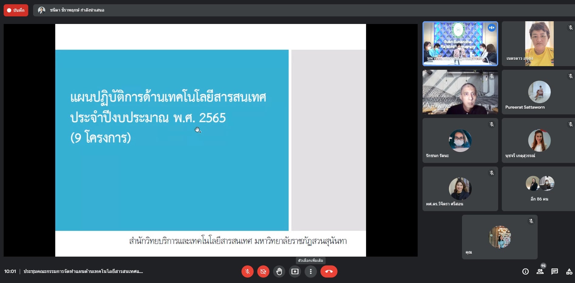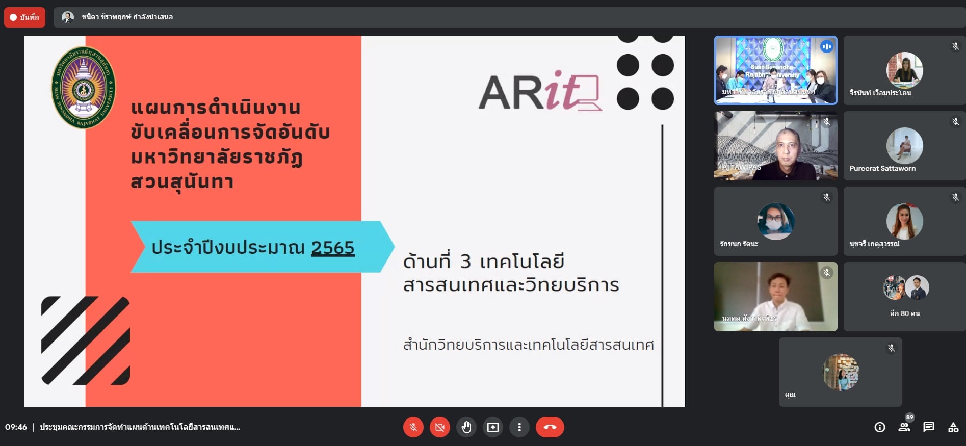 เวลา 09.00 น. วันที่ 7 กันยายน 2564 นางสาววนัสนาฎ ประพาลา รักษาการหัวหน้าสำนักงานศูนย์การศึกษาจังหวัดระนอง และนางสาวกนกวรรณ คชพันธ์ นักวิชาการศึกษา เข้าร่วมประชุมคณะกรรมการจัดทำแผนด้านเทคโนโลยีสารสนเทศและการดำเนินงานตามแผนการขับเคลื่อนการจัดอันดับมหาวิทยาลัย ระยะ 5 ปี (พ.ศ. 2565 - 2569) โดยมี ผศ.ดร.ศิริลักษณ์ เกตุฉาย ผู้อำนวยการสำนักวิทยบริการและเทคโนโลยีสารสนเทศเป็นประธาน โดยมีวาระสำคัญเกี่ยวกับการชี้แจงแนวทางการดาเนินการจัดทำแผนด้านเทคโนโลยีและสารสนเทศ ระยะ 5 ปี (พ.ศ. 2565 – 2569) และประจำปีงบประมาณ พ.ศ. 2565