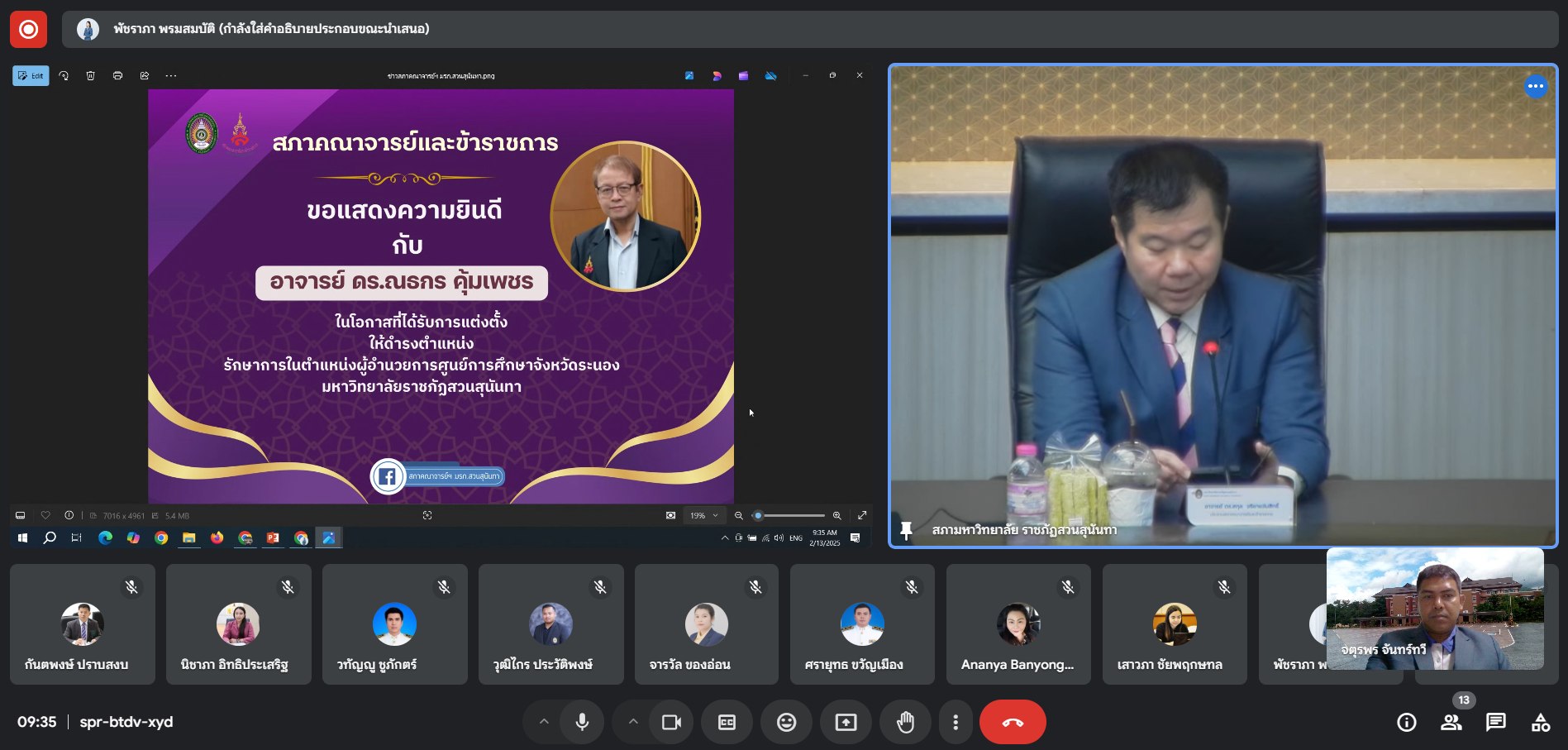 ช่วงเช้า วันที่ 13 กุมภาพันธ์ 2568 นายจตุรพร จันทร์ทวี เจ้า่หน้าที่บริหารงานทั่วไป และอาจารย์วทัญญู ชูภักตร์ หัวหน้าสาชาวิชาการจัดการโลจิสติกส์ ศูนย์การศึกษาจังหวัดระนอง ในฐานะสภาคณาจารย์และข้าราชการ มหาวิทยาลัยราชภัฏสวนสุนันทา เข้าร่วมประชุมสภาคณาจารย์และข้าราชการ มหาวิทยาลัยราชภัฏสวนสุนันทา ครั้งที่ 2/2568 ผ่านระบบการประชุมออนไลน์ ณ ศูนย์การศึกษาจังหวัดระนอง มหาวิทยาลัยราชภัฏสวนสุนันทา โดยมี อาจารย์ ดร.สกุล จริยาแจ่มสิทธิ์ ประธานสภาคณาจารย์และข้าราชการ เป็นประธานในที่ประชุม