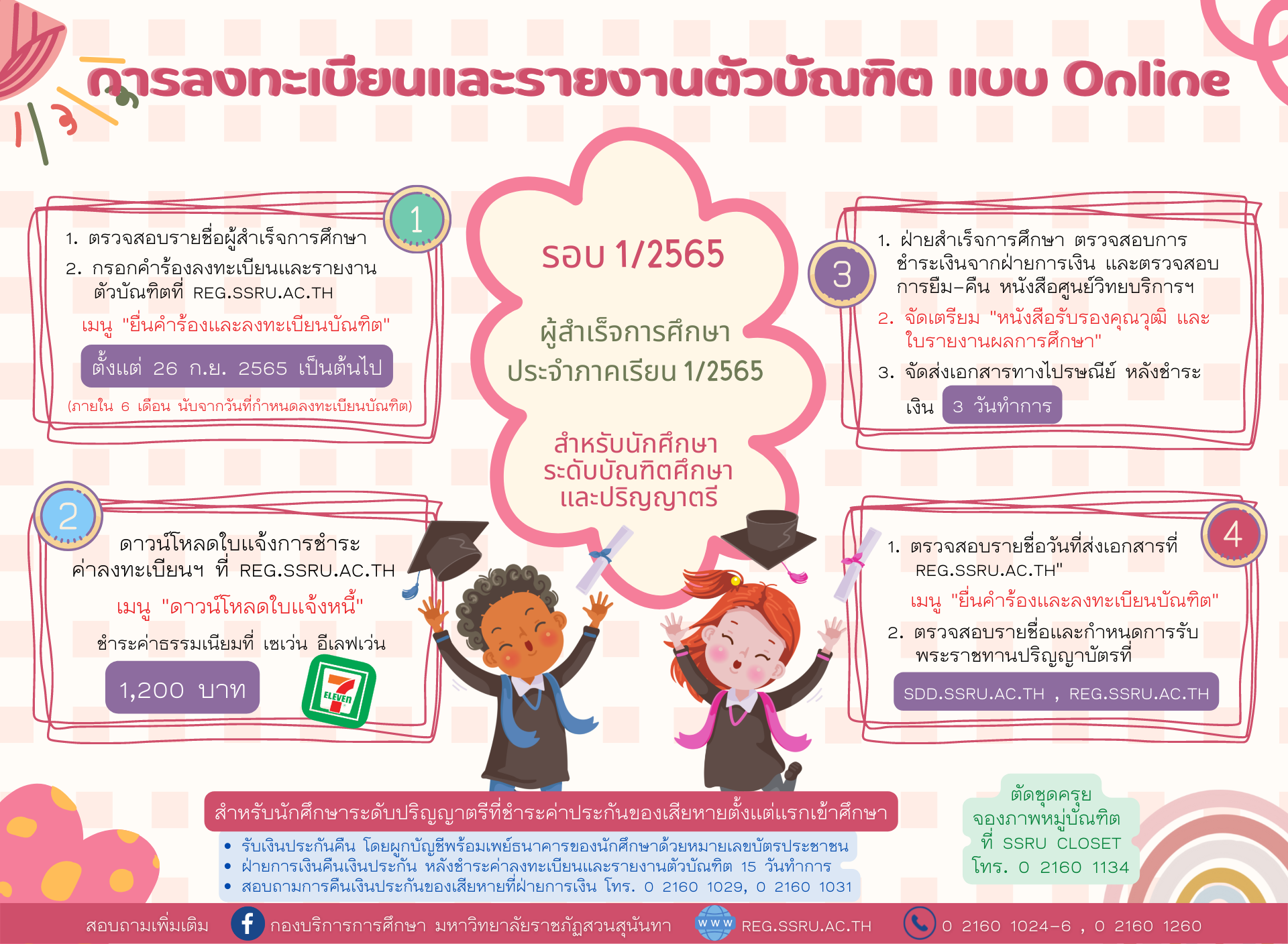 ***การลงทะเบียนและรายงานตัวบัณฑิต เพื่อรับเอกสารสำคัญทางการศึกษา ประจำปีการศึกษา 2565 รอบที่ 1/2565 สำหรับนักศึกษาระดับบัณฑิตศึกษาและปริญญาตรี ตั้งแต่วันที่ 26 กันยายน 2565 เป็นต้นไป ที่ reg.ssru.ac.th ***