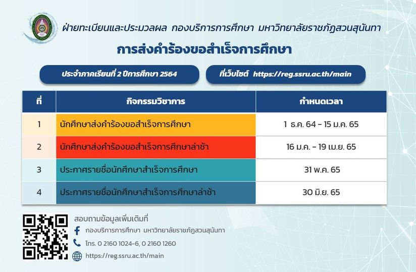 การส่งคำร้องขอสำเร็จการศึกษา ประจำภาคเรียนที่ 2 ปีการศึกษา 2564 ที่ reg.ssru.ac.th
