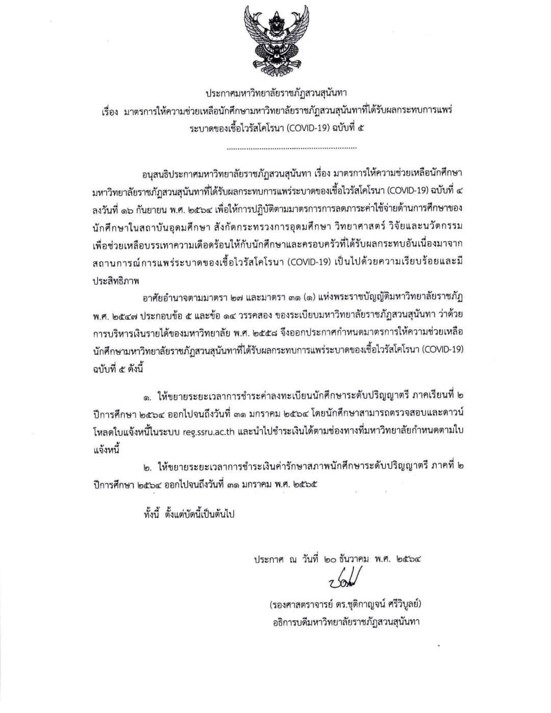 ประกาศมหาวิทยาลัยราชภัฏสวนสุนันทา เรื่อง มาตรการให้ความช่วยเหลือนักศึกษามหาวิทยาลัยราชภัฏสวนสุนันทาที่ได้รับผลการแพร่ระบาดของ COVID-19