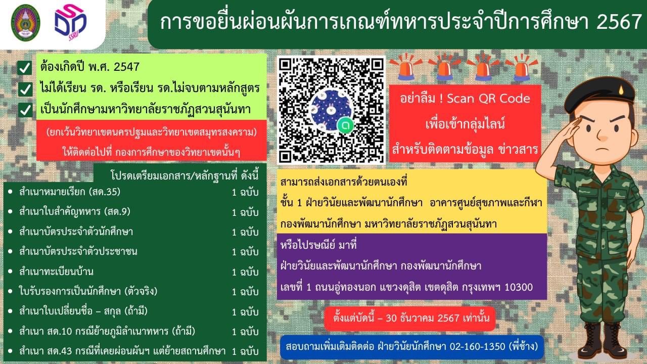 กองพัฒนานักศึกษา เปิดให้บริการขอยื่นผ่อนผันการเกณฑ์ทหาร ตั้งแต่บัดนี้ - 30 ธ.ค. 2567 นี้ เท่านั้น