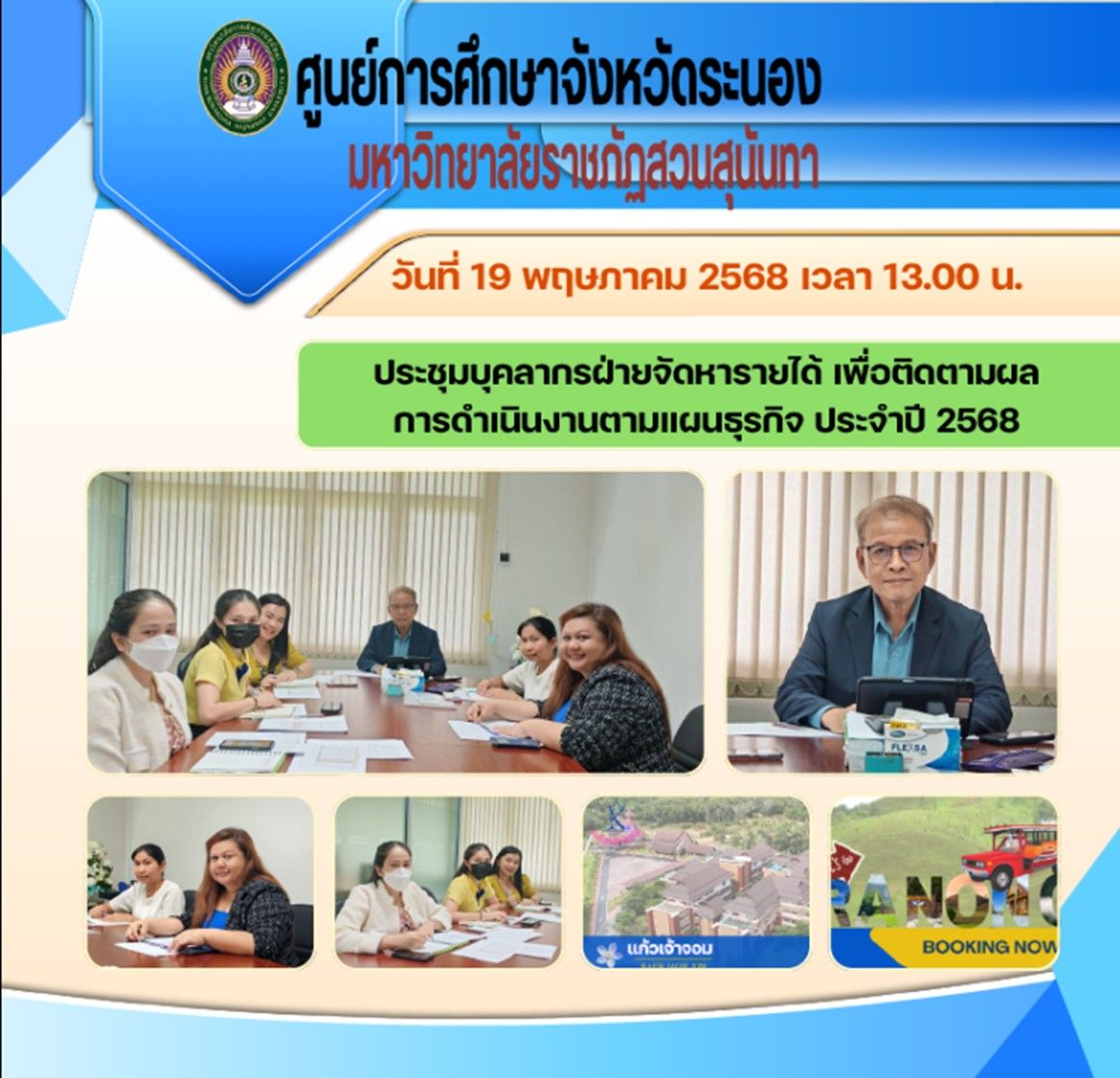 ช่วงบ่าย (19 พ.ค.68) อาจารย์ ดร.ณธกร คุ้มเพชร รักษาการในตำแหน่งผู้อำนวยการศูนย์การศึกษาจังหวัดระนอง เป็นประธานในการประชุมบุคลากรฝ่ายจัดหารายได้ เพื่อติดตามผลการดำเนินงานตามแผนธุรกิจ ประจำปี 2568 ณ ห้องประชุมสำนักงานศูนย์การศึกษาจังหวัดระนอง มหาวิทยาลัยราชภัฏสวนสุนันทา