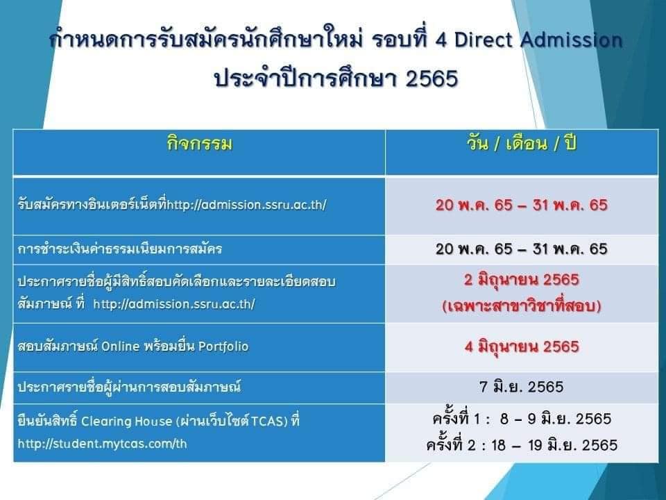 สมัครเข้าศึกษาต่อได้ที่ https://admission.ssru.ac.th/