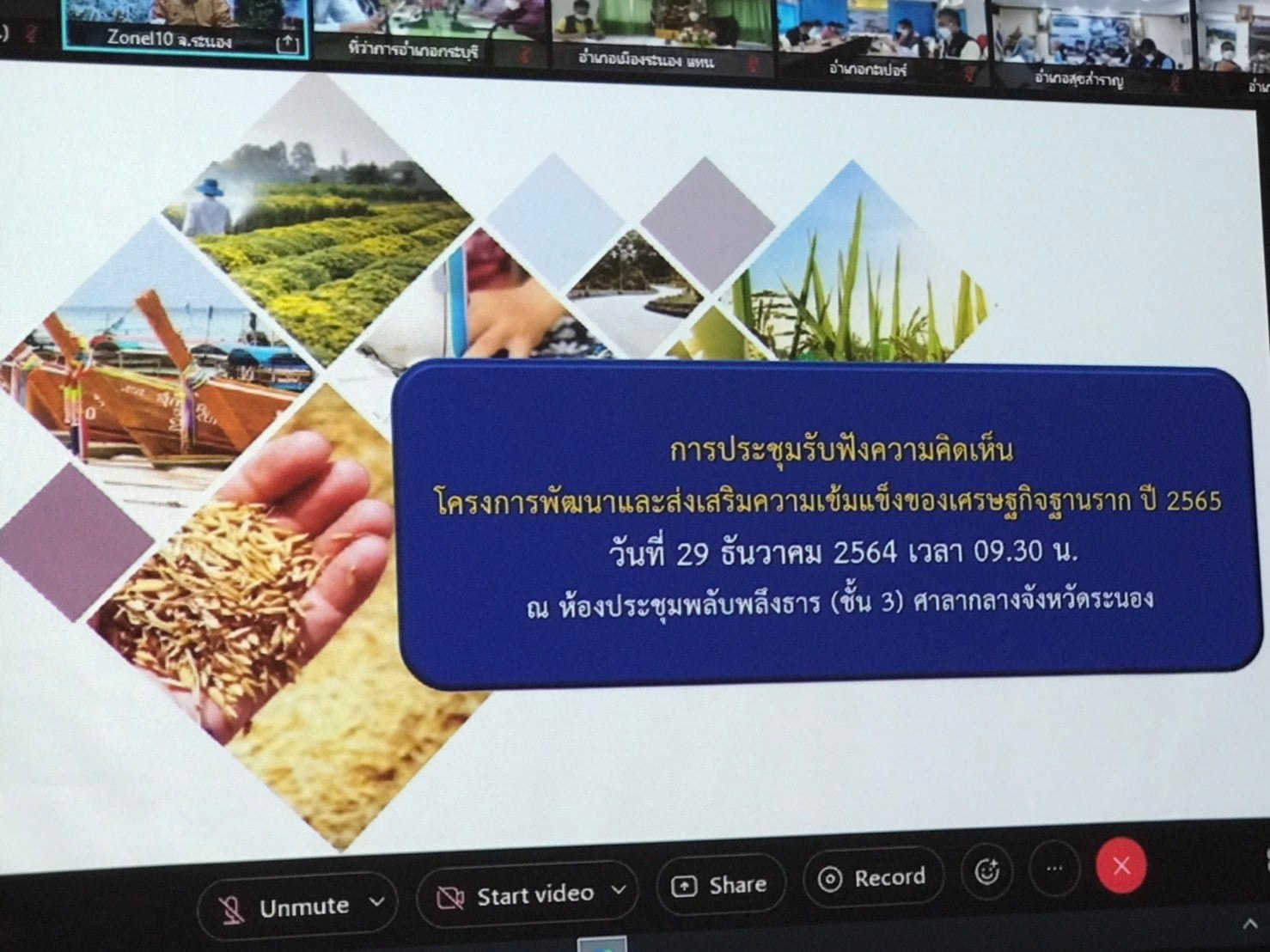 ช่วงเช้า  วันที่  29  ธันวาคม  2564  อาจารย์สุวัฒน์  นวลขาว  ผู้อำนวยการศูนย์การศึกษาจังหวัดระนอง  เข้าร่วมการประชุมรับฟังความคิดเห็นข้อเสนอแผนงาน/โครงการพัฒนาและส่งเสริมความเข้มแข็งของเศรษฐกิจฐานราก  ปี  2565  ของจังหวัดระนอง  ณ  ห้องประชุมพลับพลึงธาร  ชั้น  3  ศาลากลางจังหวัดระนอง  และเชื่อมโยงผ่านระบบวีดิทัศน์ทางไกล (VCS) ไปยังอำเภอทุกอำเภอ  โดยมีหัวหน้าสำนักงานจังหวัดกล่าวเปิดประชุม  โดยการประชุมครั้งนี้ได้มีการชี้แจงแนวทางการจัดทำข้อเสนอแผนงาน/โครงการพัฒนาและเสริมสร้างความเข้มแข็งเศรษฐกิจฐานราก  ปี 2565  พร้อมทั้งนำเสนอโครงการพัฒนาฯดังกล่าว และเปิดให้ผู้เข้าร่วมประชุมแสงดความคิดเห็นต่อแผนงาน/โครงการพัฒนาฯ