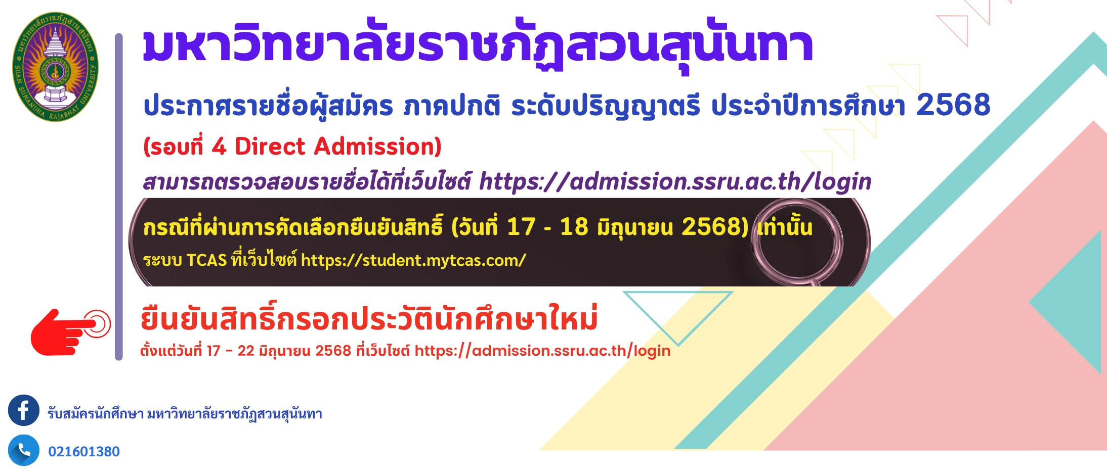มหาวิทยาลัยราชภัฏสวนสุนันทา ประกาศรายชื่อผู้สมัคร ภาคปกติ ระดับปริญญาตรี ประจำปีการศึกษา 2568 (รอบที่ 4 Direct Admission)