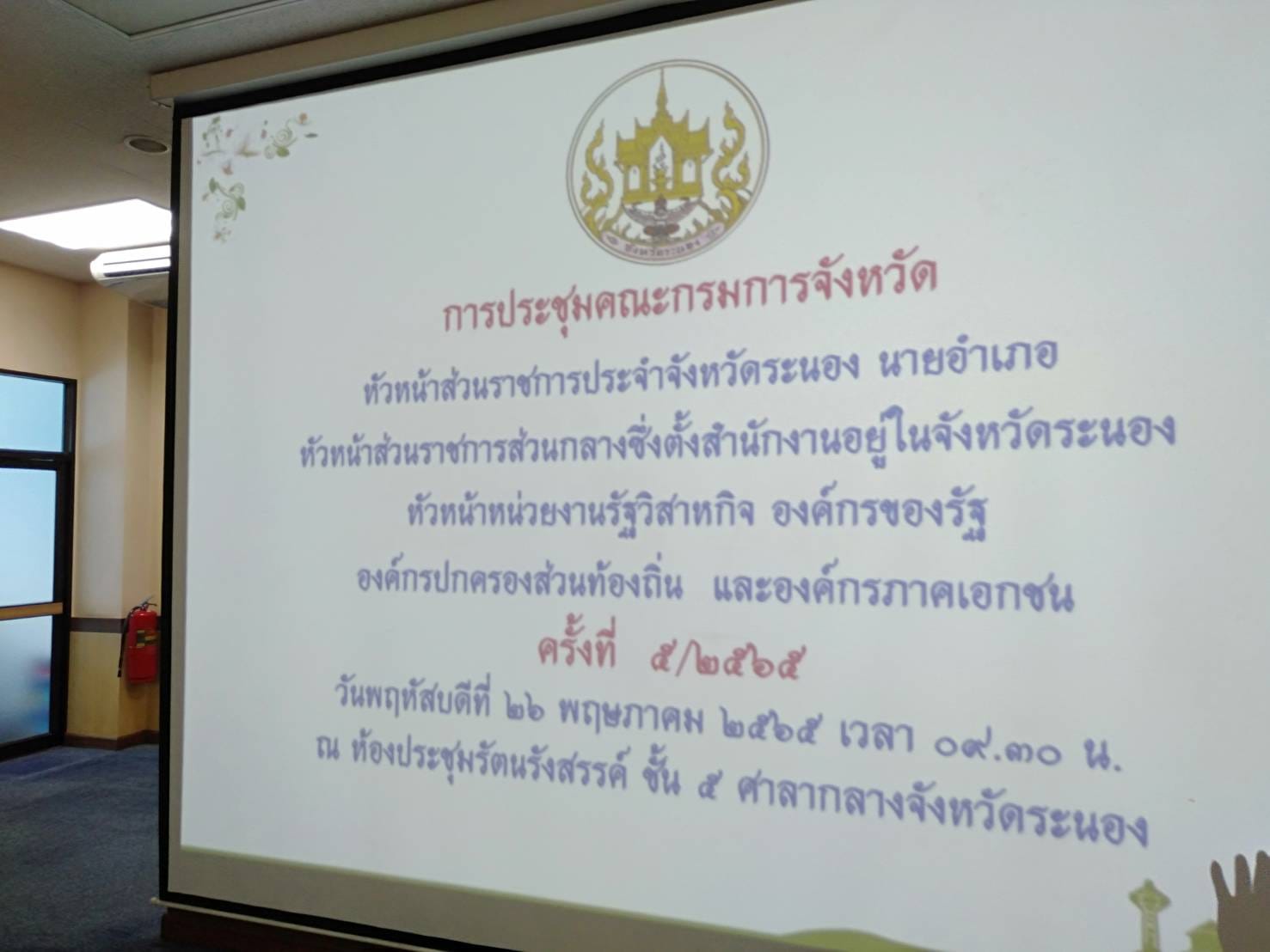 วันที่ 26  พฤษภาคม 2565 เวลา 09.30 น.ดร.สุวัฒน์ นวลขาว ผู้อำนวยการศูนย์การศึกษาจังหวัดระนอง  เข้าร่วมการประชุมคณะกรมการจังหวัด ครั้งที่ 5/2565 ณ ห้องประชุมรัตนรังสรรค์ ชั้น 5  ศาลากลางจังหวัดระนอง โดยมีนายสมเกียรติ ศรีษะเนตร ผู้ว่าราชการจังหวัดระนองเป็นประธาน  และมีหัวหน้าส่วนราชการประจำจังหวัดระนอง นายอำเภอ หัวหน้าราชการส่วนกลางซึ่งตั้งสำนักงานอยู่ในจังหวัดระนอง หัวหน้าหน่วยงานรัฐวิสาหกิจ องค์กรของรัฐ องค์กรปกครองส่วนท้องถิ่นและองค์กรภาคเอกชนเข้าร่วมประชุมโดยพร้อมเพรียงกัน