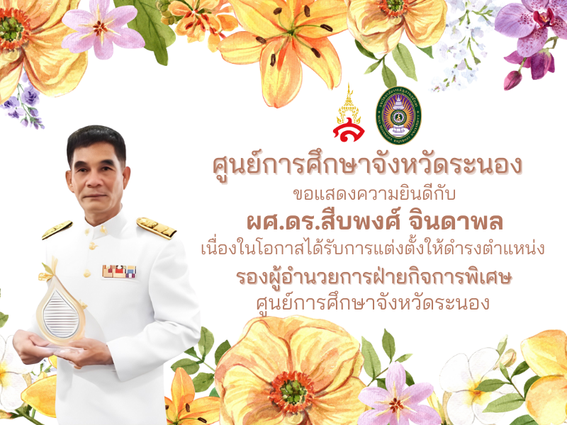 ศูนย์การศึกษาจังหวัดระนองขอแสดงความยินดีกับ ผศ.ดร.สืบพงศ์ จินดาพล เนื่องในโอกาสได้รับการแต่งตั้งให้ดำรงตำแหน่งผู้อำนวยการฝ่ายกิจการพิเศษ