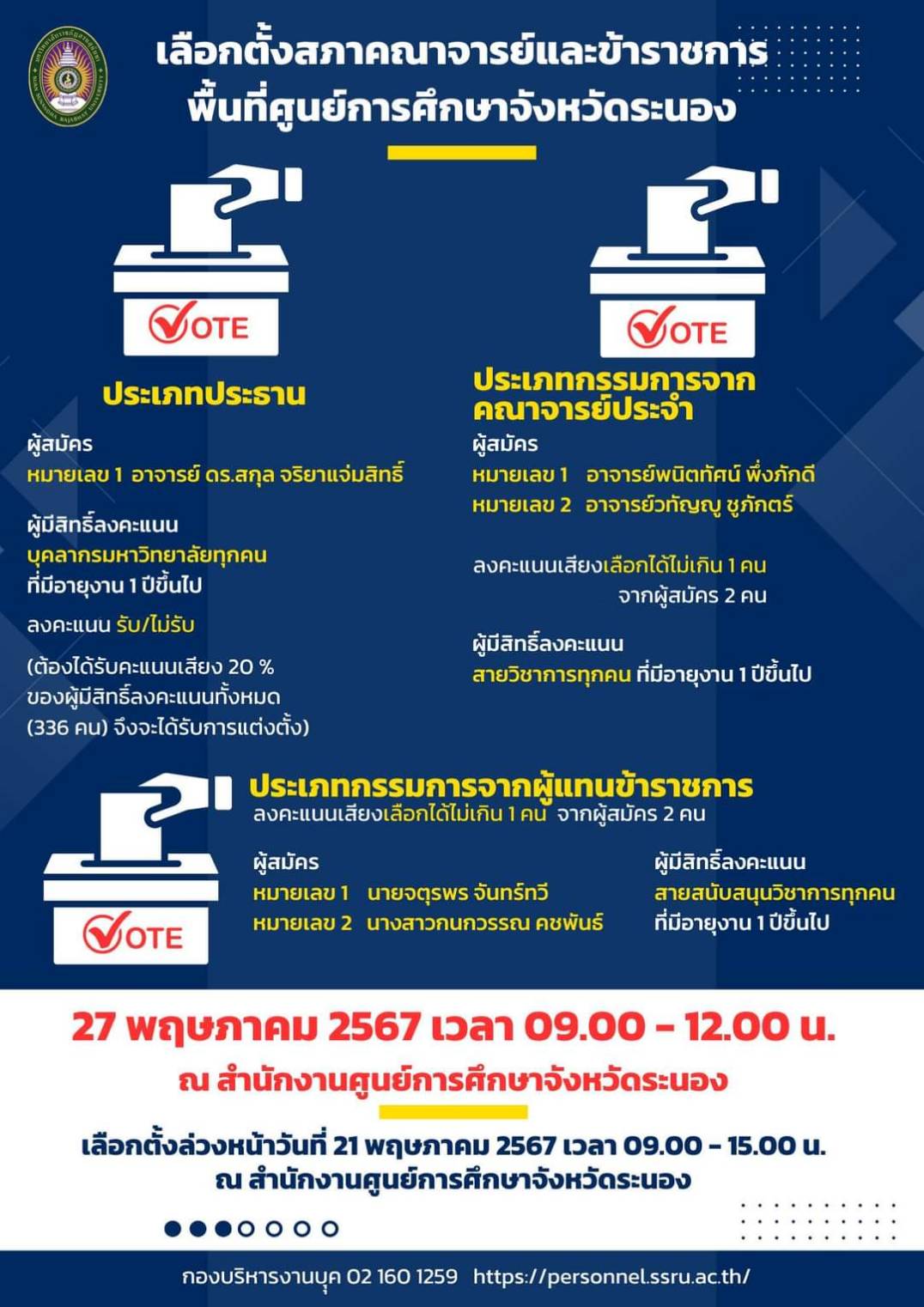 ขอเชิญบุคลากรมหาวิทยาลัยราชภัฏสวนสุนันทา ศูนย์การศึกษาจังหวัดระนองทุกท่าน ที่มีอายุงาน 1 ปีขึ้นไปเลือกตั้งสภาคณาจารย์และข้าราชการ