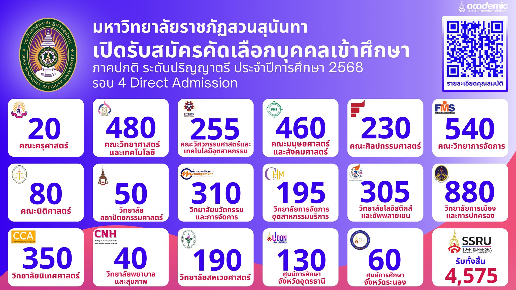 **ประกาศรับสมัครนักศึกษาใหม่ ภาคปกติ ระดับปริญญาตรี ประจำปีการศึกษา 2568 (รอบที่ 4 Direct Admission) คลิกที่นี่ https://admission.ssru.ac.th/isqy03