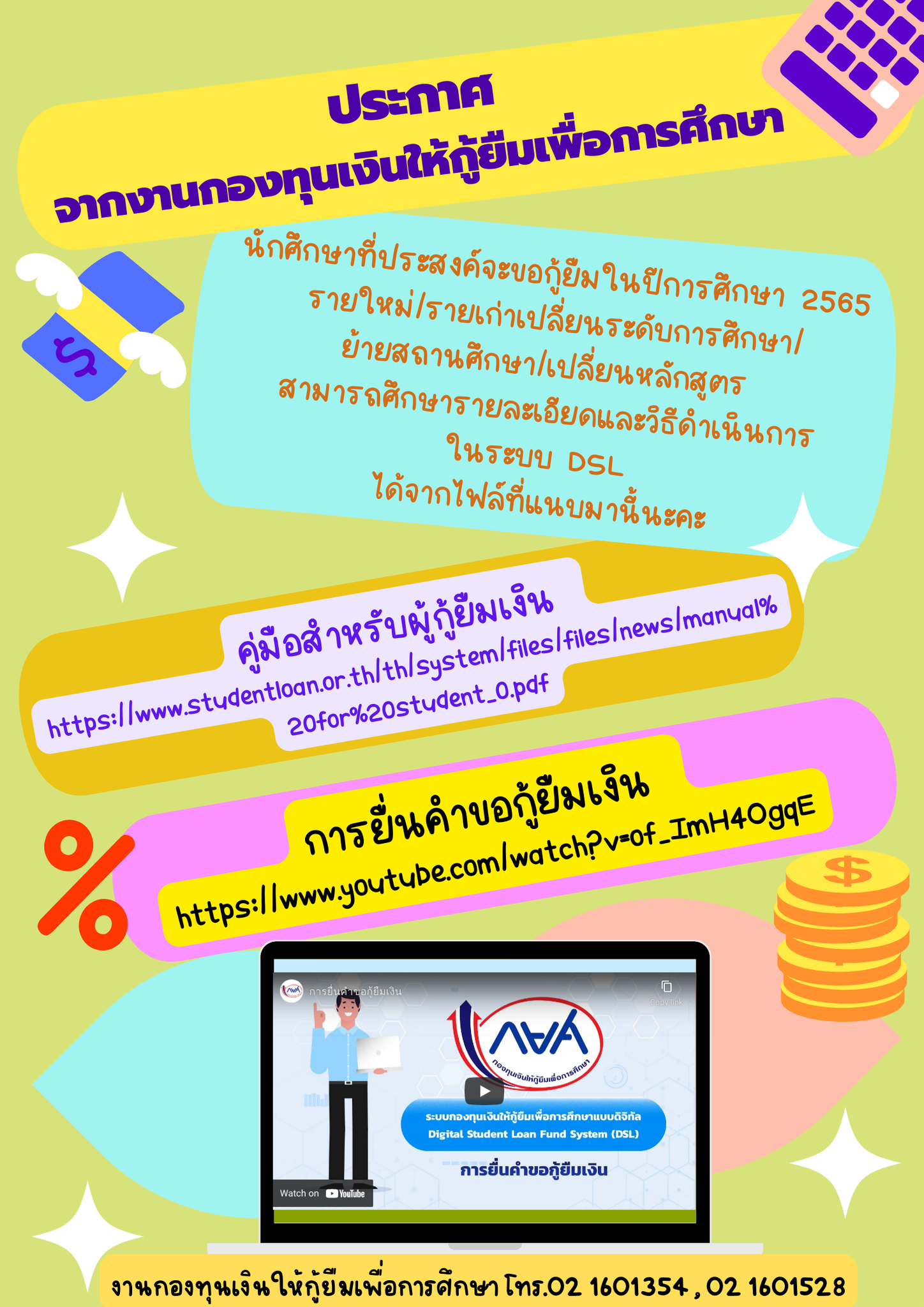 งานกองทุนเงินให้กู้ยืมเพื่อการศึกษา โทร.02 1601354 , 02 1601528