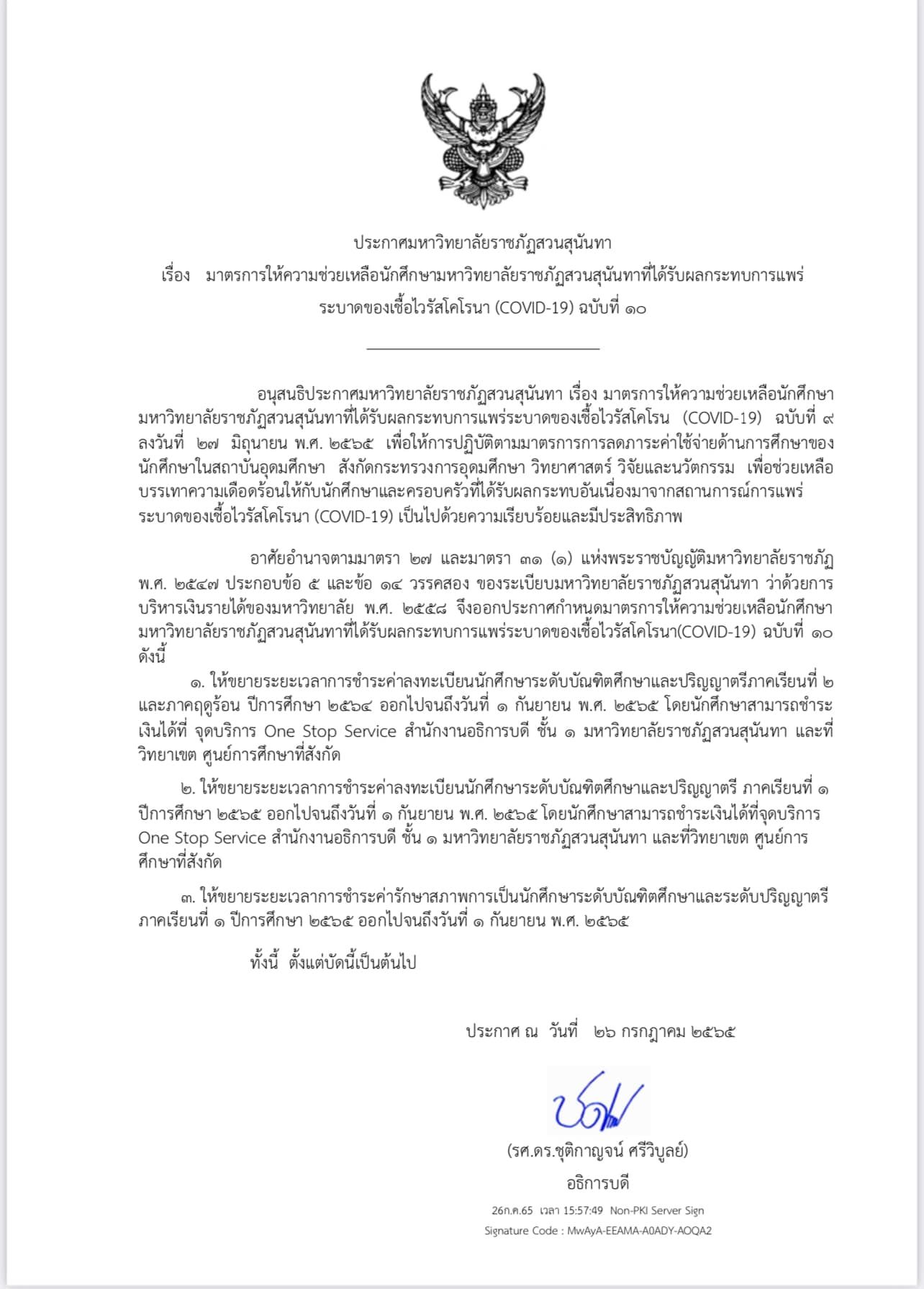 ประกาศมหาวิทยาลัยราชภัฏสวนสุนันทา เรื่อง มาตรการให้ความช่วยเหลือนักศึกษามหาวิทยาลัยราชภัฏสวนสุนันทา ที่ได้รับผลกระทบการแพร่ระบาดของเชื้อไว้รัสโคโรนา (COVID-19) ฉบับที่ 10