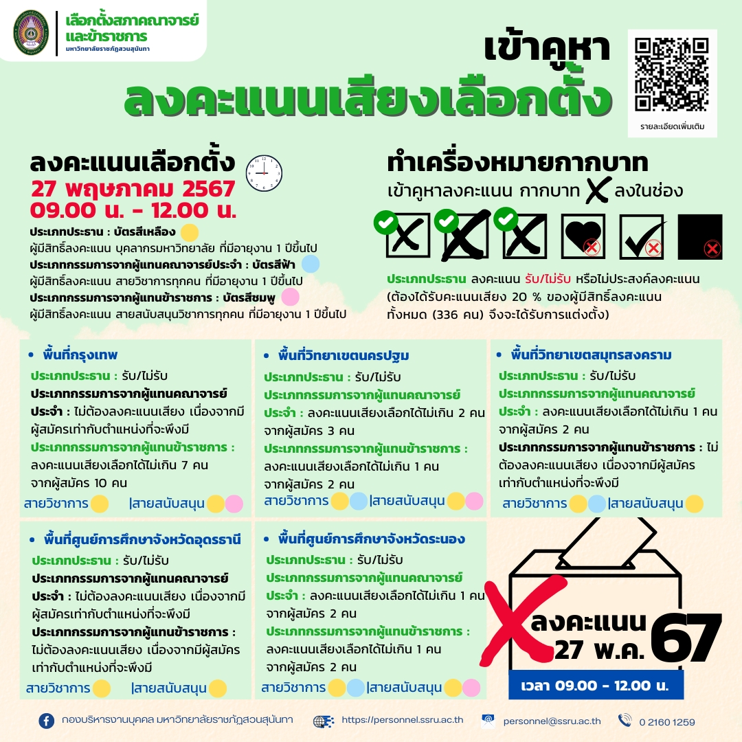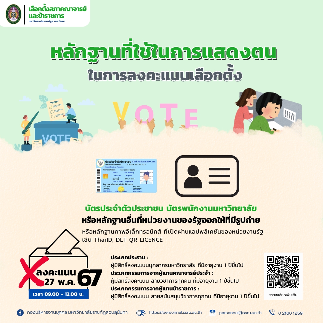 ขอเชิญบุคลากรมหาวิทยาลัยราชภัฏสวนสุนันทาทุกท่าน ที่มีอายุงาน 1 ปีขึ้นไปเลือกตั้งสภาคณาจารย์และข้าราชการ