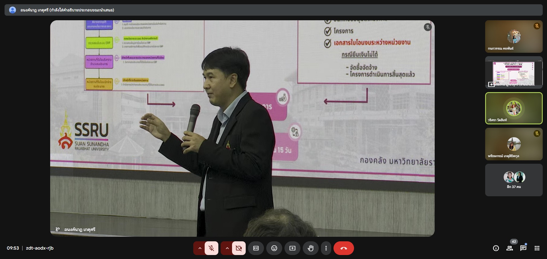 วันที่ 29 พฤษภาคม 2568 เวลา 09.00 น. มหาวิทยาลัยราชภัฏสวนสุนันทา ศูนย์การศึกษาจังหวัดระนอง นำโดย อาจารย์ ดร.ณธกร คุ้มเพชร รักษาการในตำแหน่งผู้อำนวยการศูนย์การศึกษาจังหวัดระนอง พร้อมด้วยนางสาวพรัชษกรณ์ เกตุลิขิตกุล นักวิเคราะห์นโยบายและแผน และนางสาวกนกวรรณ คชพันธ์ เจ้าหน้าที่บริหารงานทั่วไป ได้เข้าร่วมประชุมแจ้งแนวทางการดำเนินงานแผนธุรกิจ มหาวิทยาลัยราชภัฏสวนสุนันทา ผ่านระบบการประชุมออนไลน์ โดยมี ผู้ช่วยศาสตราจารย์ ดร.คมสัน โสมณวัตร รองอธิการบดีฝ่ายบริหาร มหาวิทยาลัยราชภัฏสวนสุนันทา เป็นประธานในการประชุม และ ดร.มนตรี ไทรโรจน์รุ่ง ผู้อำนวยการกองคลัง มหาวิทยาลัยราชภัฏสวนสุนันทา ร่วมชี้แจงแนวทางในการดำเนินงาน