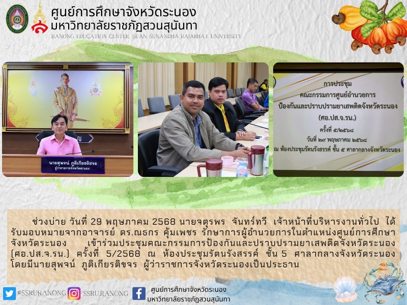 ช่วงบ่าย วันที่ 29 พฤษภาคม 2568 นายจตุรพร จันทร์ทวี เจ้าหน้าที่บริหารงานทั่วไป ได้รับมอบหมายจากอาจารย์ ดร.ณธกร คุ้มเพชร รักษาการผู้อำนวยการในตำแหน่งศูนย์การศึกษาจังหวัดระนอง เข้าร่วมประชุมคณะกรรมการป้องกันและปราบปรามยาเสพติดจังหวัดระนอง (ศอ.ปส.จ.รน.) ครั้งที่ 5/2568 ณ ห้องประชุมรัตนรังสรรค์ ชั้น 5 ศาลากลางจังหวัดระนอง โดยมีนายสุพจน์ ภูติเกียรติขจร ผู้ว่าราชการจังหวัดระนองเป็นประธาน