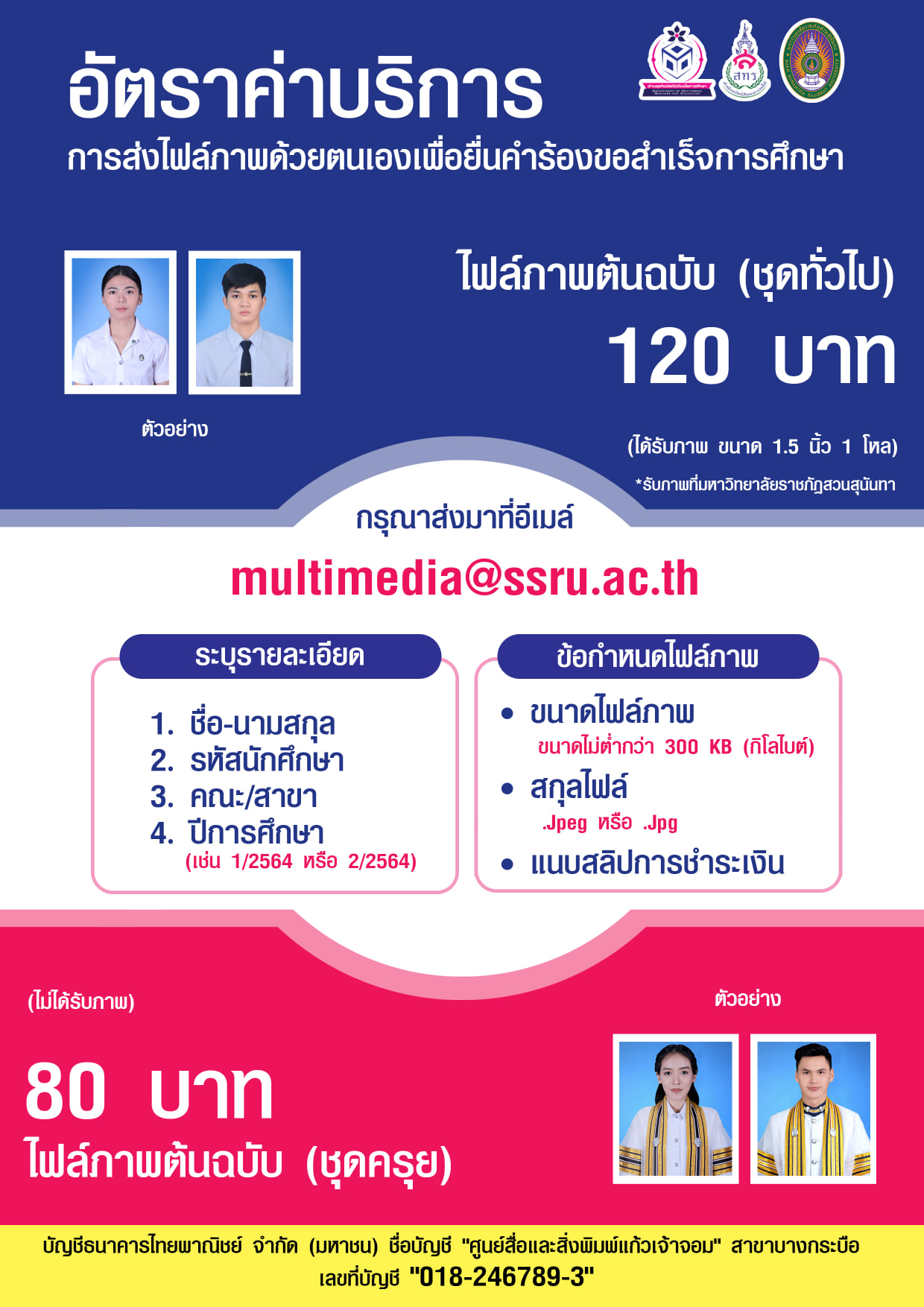 2. หลักฐานการชำระเงิน (ไฟล์ภาพชุดครุย 80 บาท) หรือ (ไฟล์ภาพชุดอื่นๆ 120 บาท)