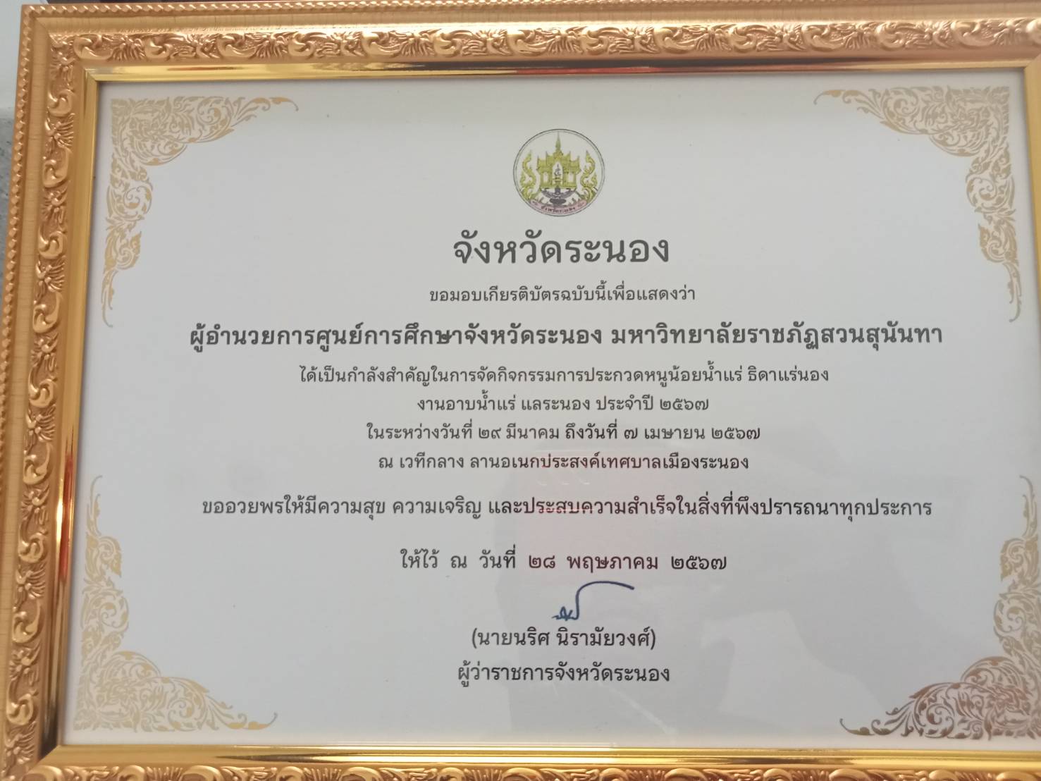 ช่วงเช้า วันศุกร์ที่ 31 พฤษภาคม 2567 อาจารย์ ดร.สุวัฒน์ นวลขาว ผู้อำนวยการศูนย์การศึกษาจังหวัดระนอง เข้ารับเกียรติบัตรจากนายนริศ นิรามัยวงศ์ ผู้ว่าราชการจังหวัดระนอง เนื่องในโอกาสได้เป็นกำลังสำคัญในการจัดกิจกรรรมการประกวดหนูน้อยน้ำแร่ ธิดาแร่นอง งานอาบน้ำแร่ แลระนอง ประจำปี 2567 ก่อนเข้าร่วมการประชุมคณะกรมการจังหวัดระนอง หัวหน้าส่วนราชการ หัวหน้าหน่วยงาน นายอำเภอ ผู้บริหารองค์กรปกครองส่วนท้องถิ่น และองค์กรภาคเอกชน ครั้งที่ 5/2567 ณ ห้องประชุมรัตนรังสรรค์ ชั้น 5 ศาลากลางจังหวัดระนอง